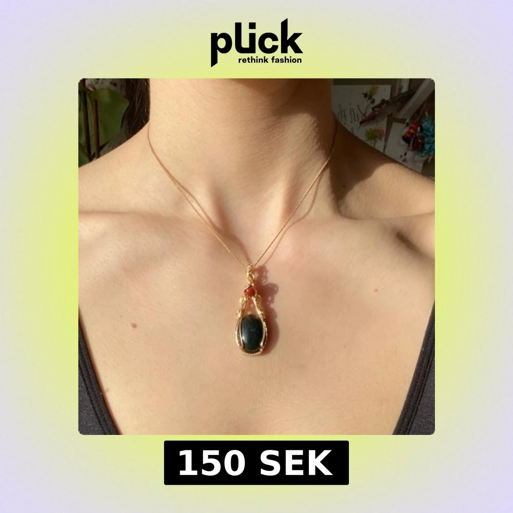 Unikt halsband med en stor mörkgrön sten och en mindre röd sten, infattade i en dekorativ guldfärgad ram. Kedja ingår inte i priset. Perfekt för dig som gillar smycken med naturinspirerade stenar och elegant design.