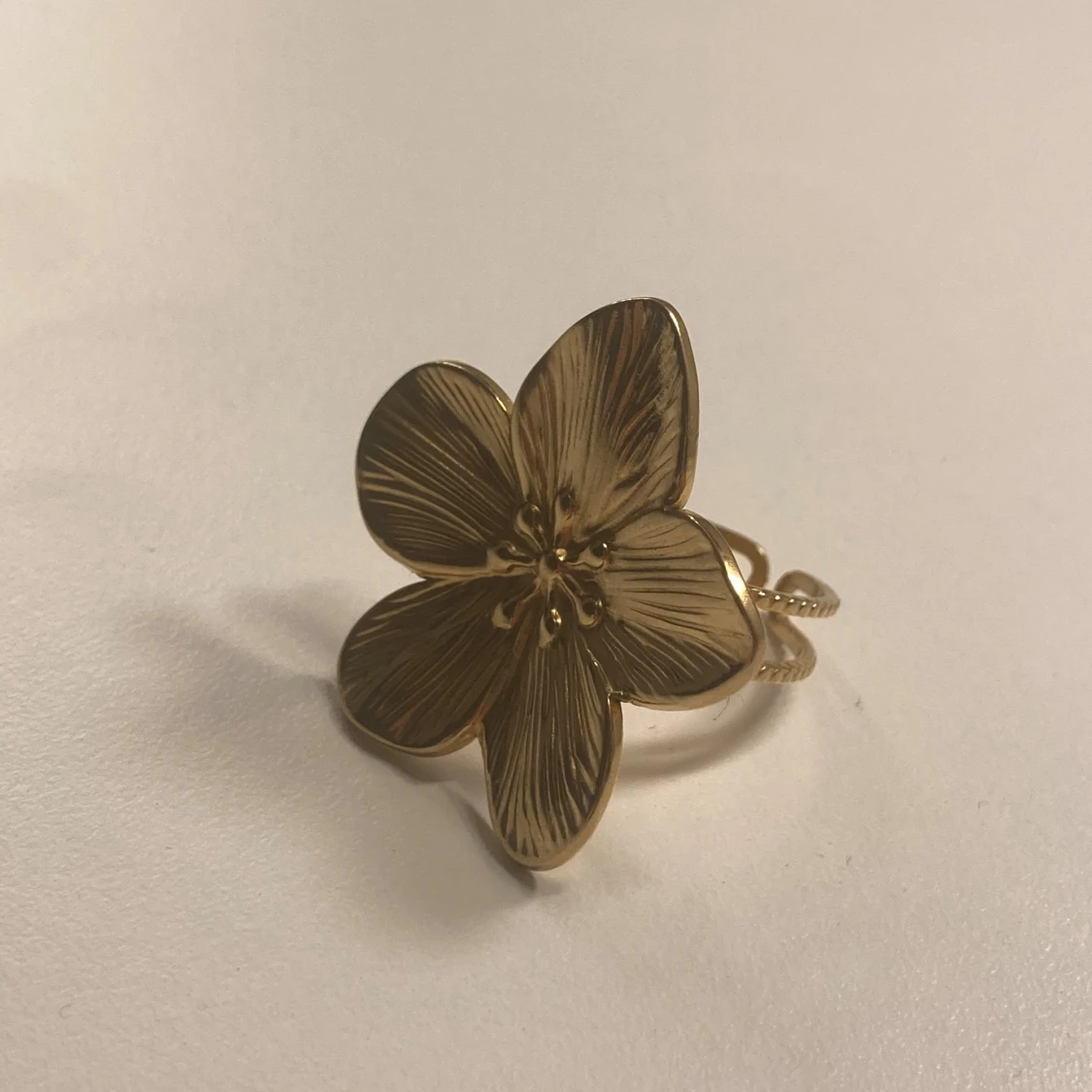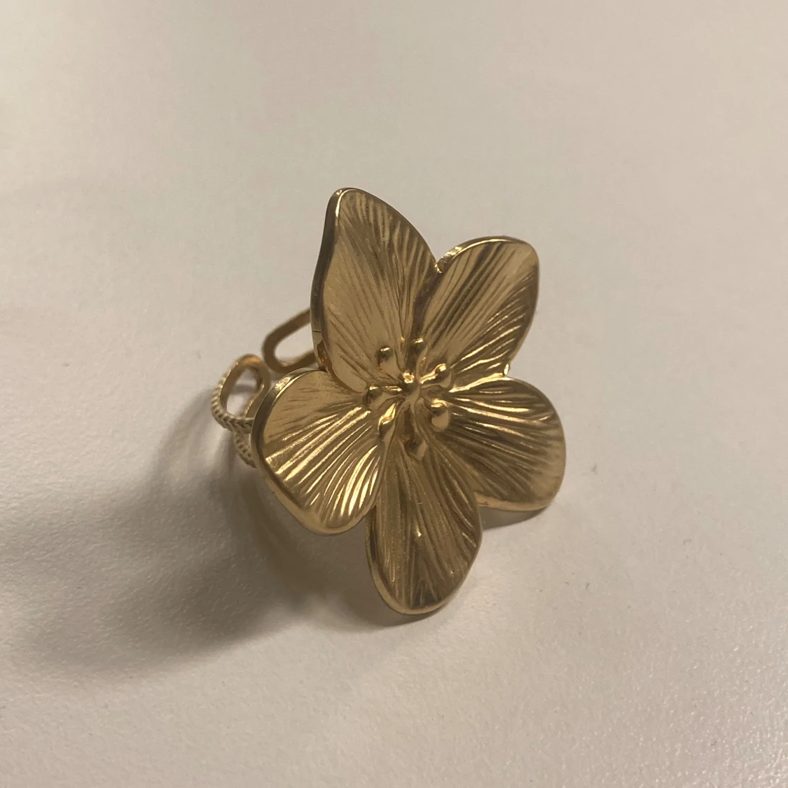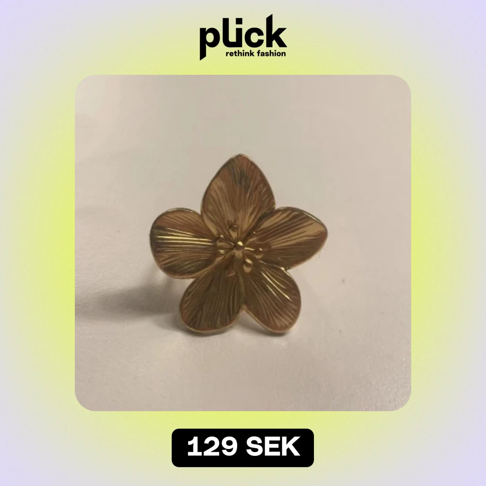 Säljer en superfin guldfärgad ring formad som en blomma. Den har detaljerade blomblad som ger en elegant och stilren look. Perfekt för att piffa upp vilken outfit som helst!