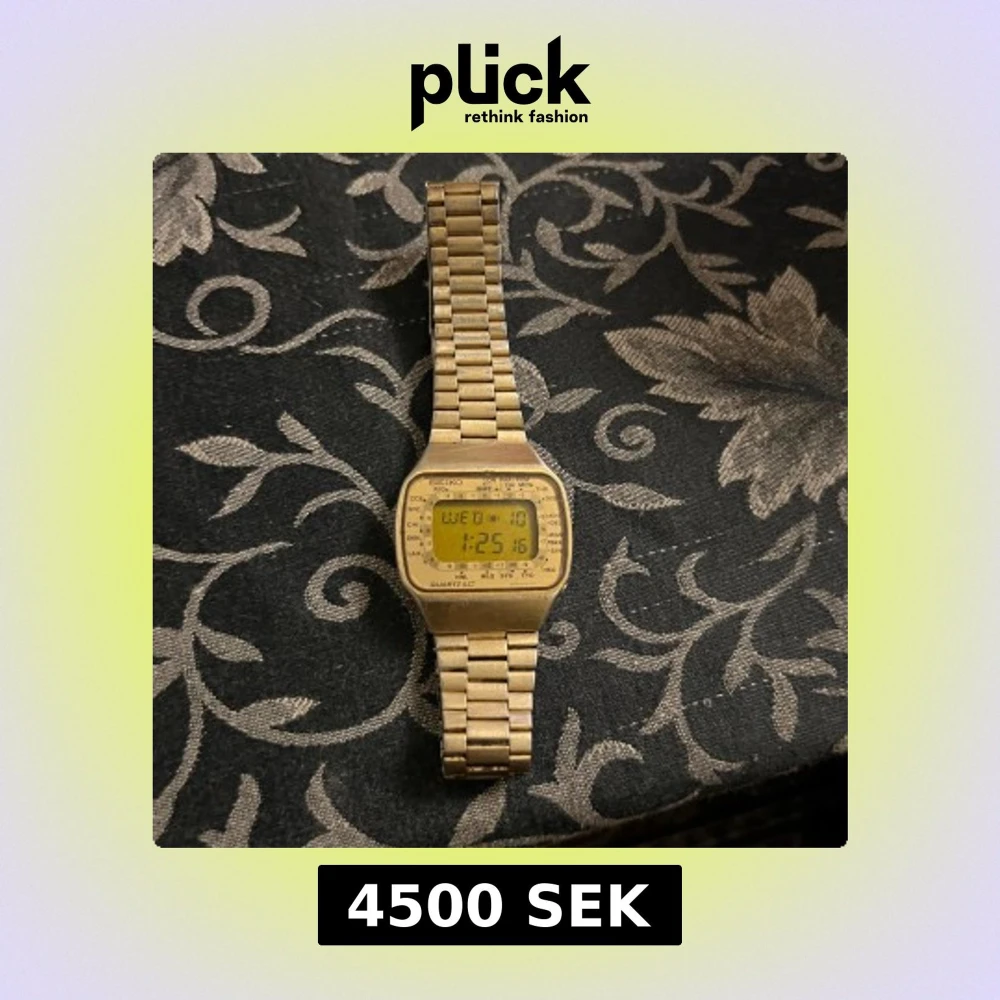 Säljer en stilren guldfärgad digital klocka från Seiko med metallarmband. Klockan har en fyrkantig urtavla med digital display och flera funktioner som datum och tidtagning. Perfekt för dig som gillar retrostil!