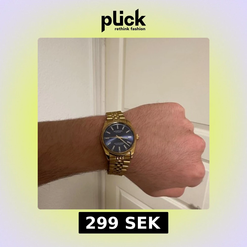 Snygg guldfärgad klocka från Kompass med blå urtavla och guldfärgade visare. Armbandet är i metall med en klassisk länkdesign. Perfekt för den som vill ha en stilren och elegant accessoar.
