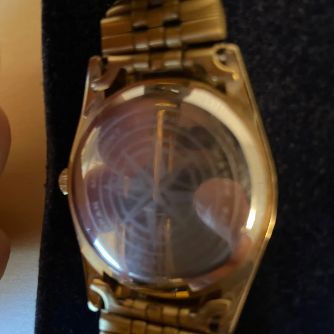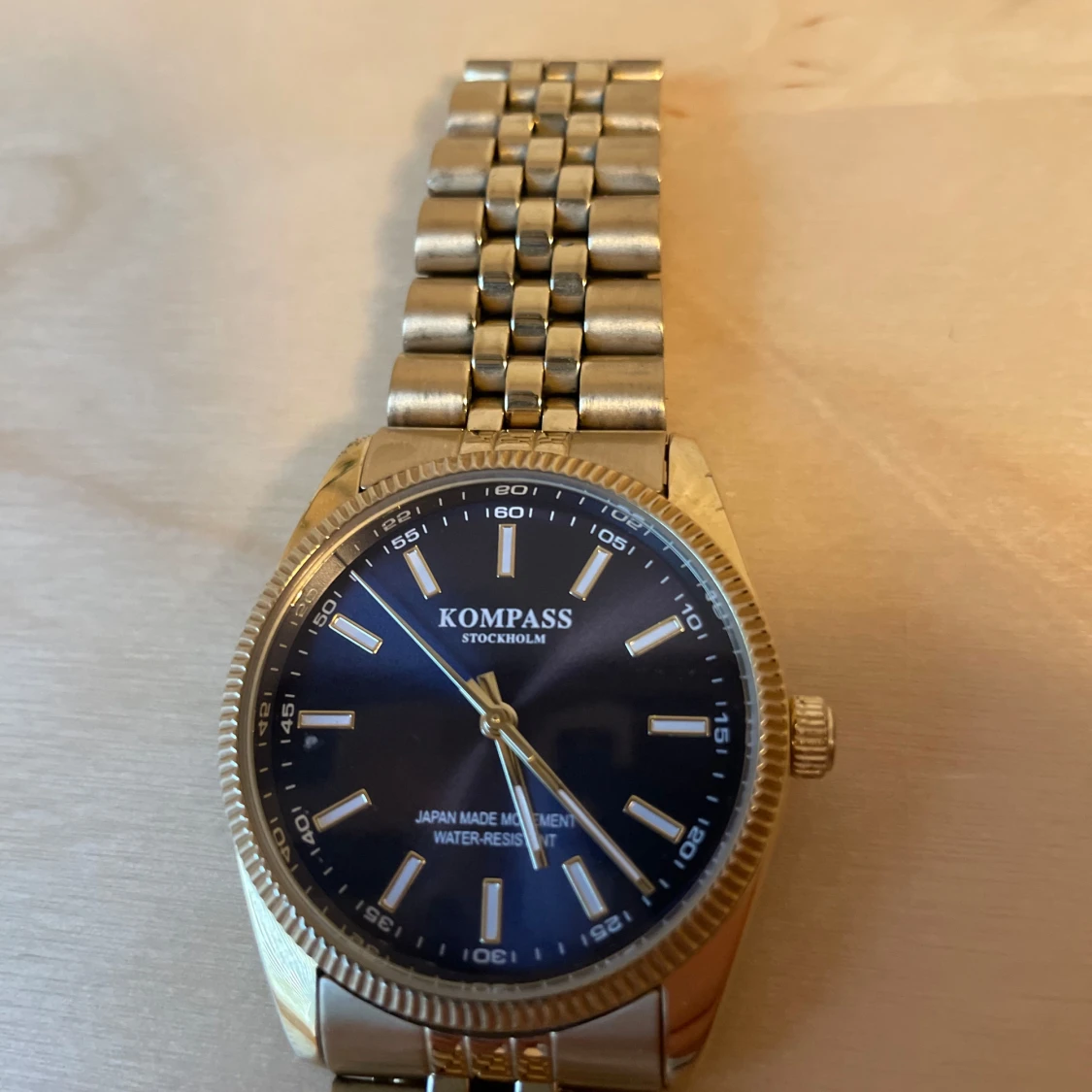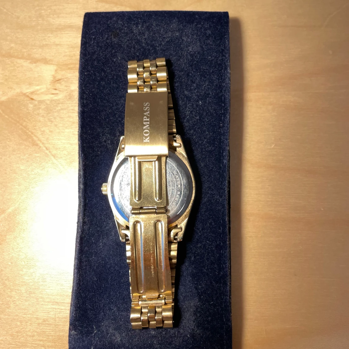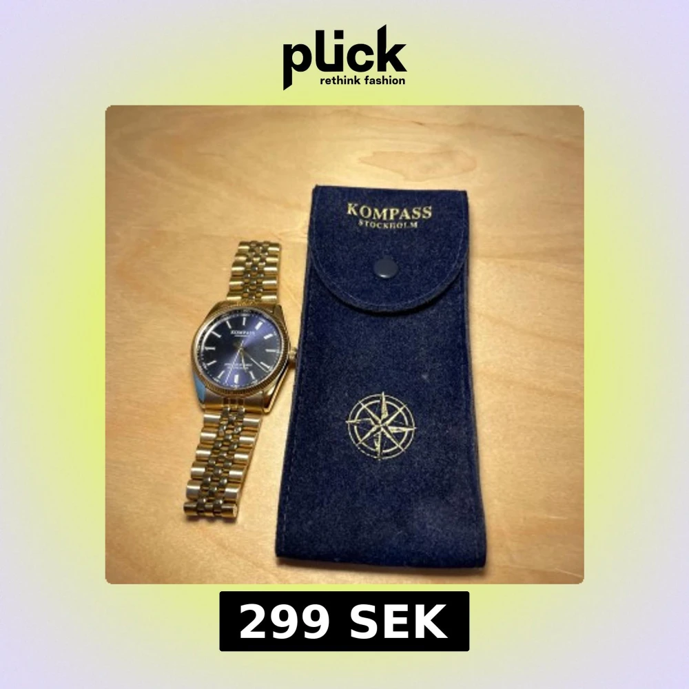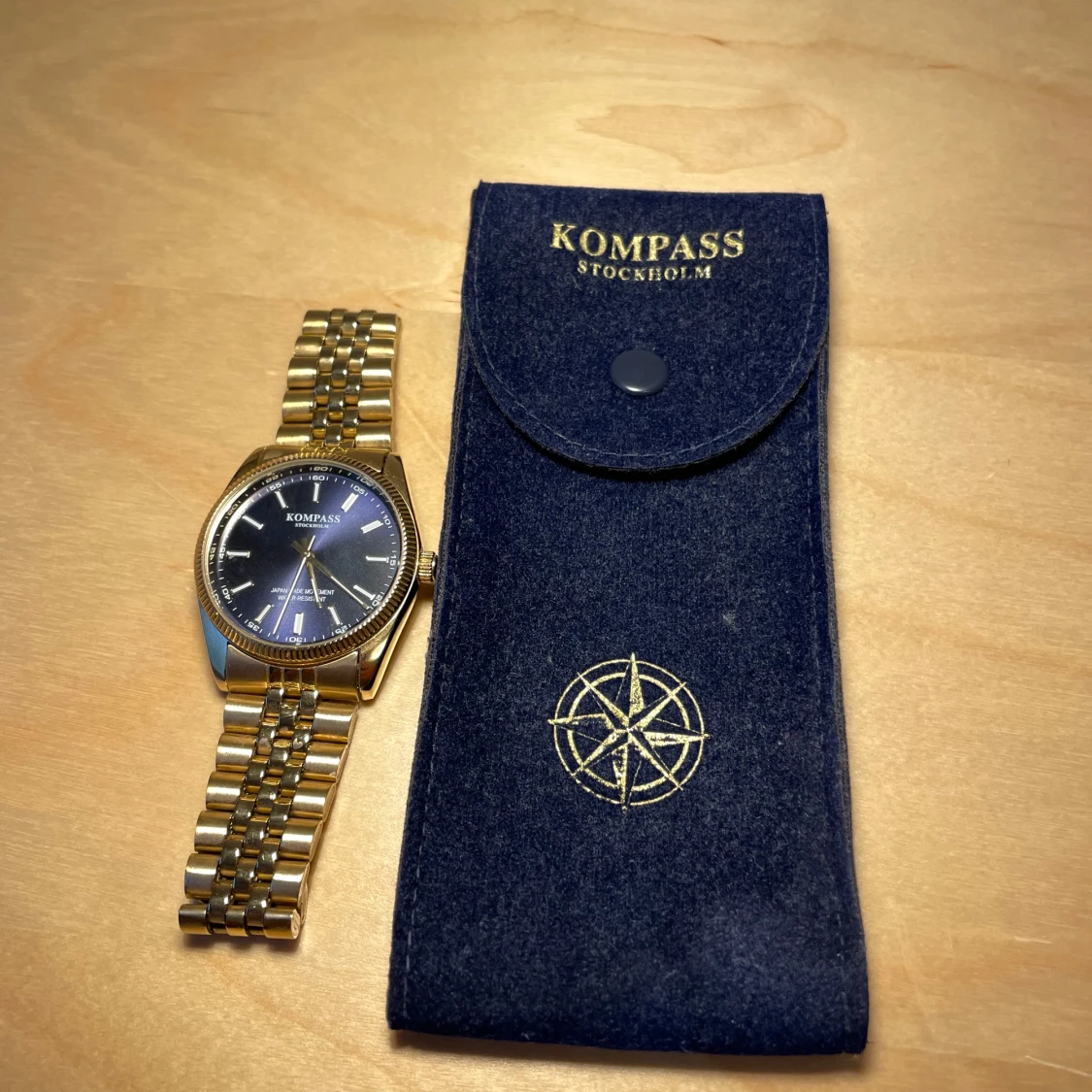 Stilrene klocka från Kompass Stockholm med guldfärgad länk i metall och mörkblå urtavla. Klockan har tydliga indexmarkeringar och klassisk rund form. Levereras med ett mörkblått fodral med gulddetaljer. Perfekt accessoar för dig som gillar snygga detaljer.