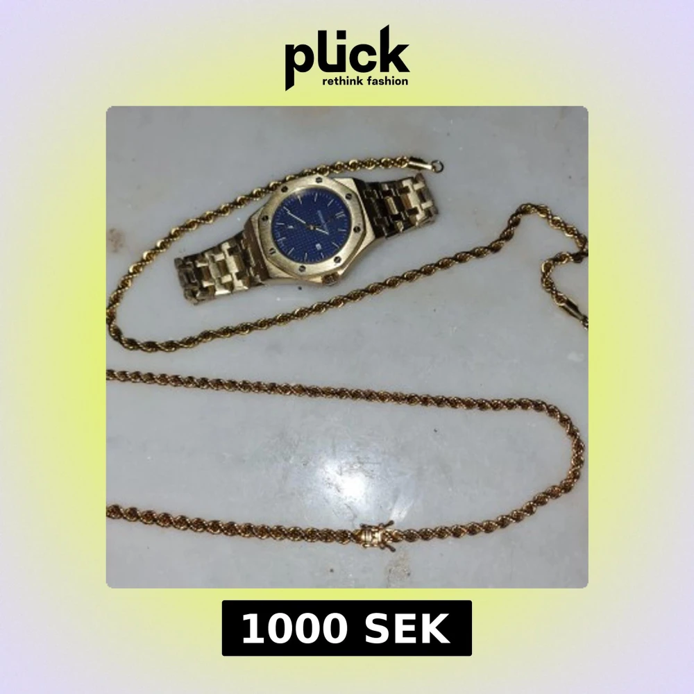 Stilren guldfärgad klocka med blå urtavla och metallarmband. Klockan har en rund boett med markerade skruvar och tydliga indexmarkeringar. Passar dig som gillar klassisk design med en modern touch.
