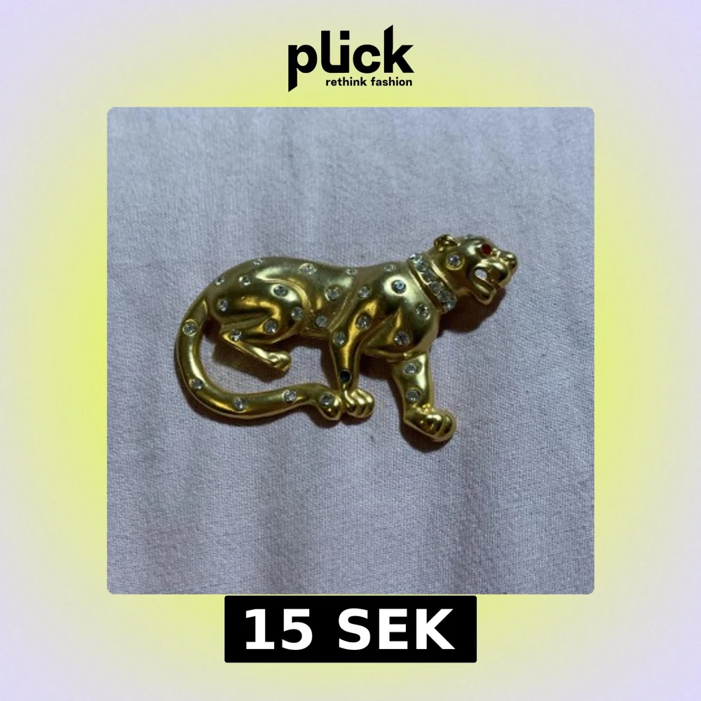 Elegant guldfärgad brosch i form av en leopard, dekorerad med glittrande stenar, en sten saknas.