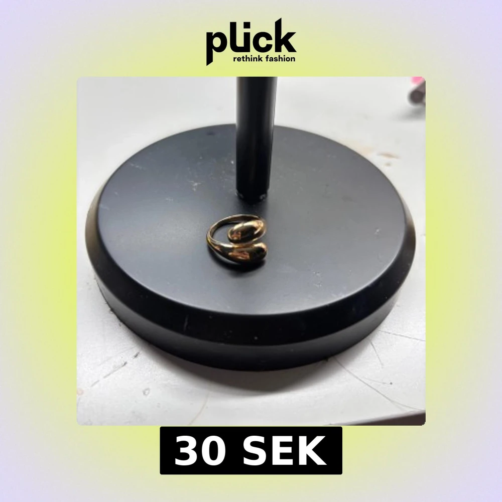 Säljer en stilren guldfärgad ring med en öppen, böjd form som ger en modern och trendig känsla. Perfekt accessoar för att lyfta din outfit med en elegant touch.