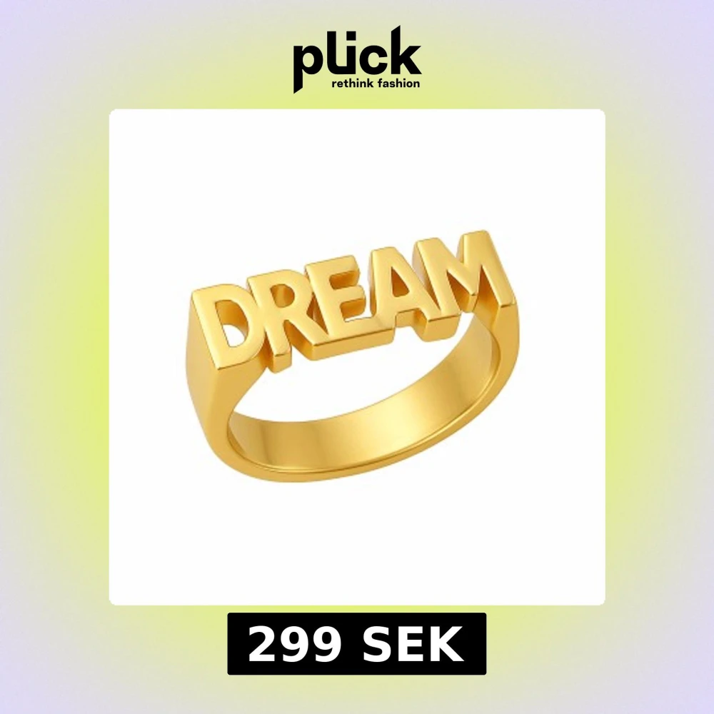 Cool ring i guldfärgad metall med texten DREAM i stora bokstäver. Perfekt statement piece för dig som vill sticka ut och sprida positiva vibes. Ringen har en modern och stilren design som passar till många olika looks.
