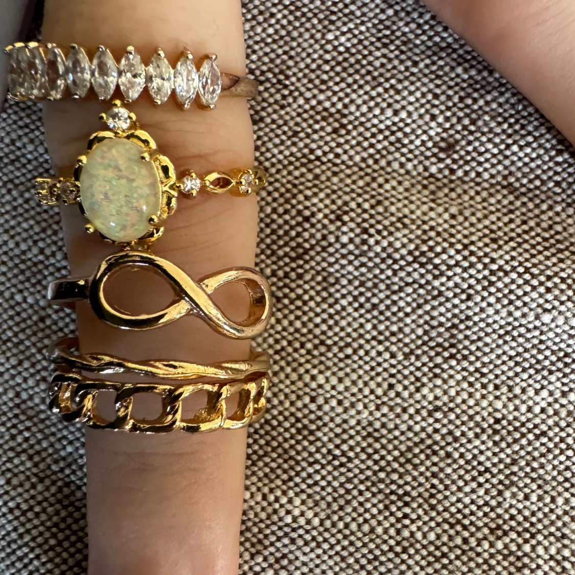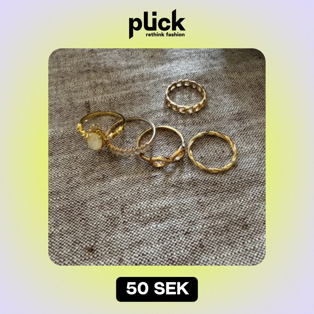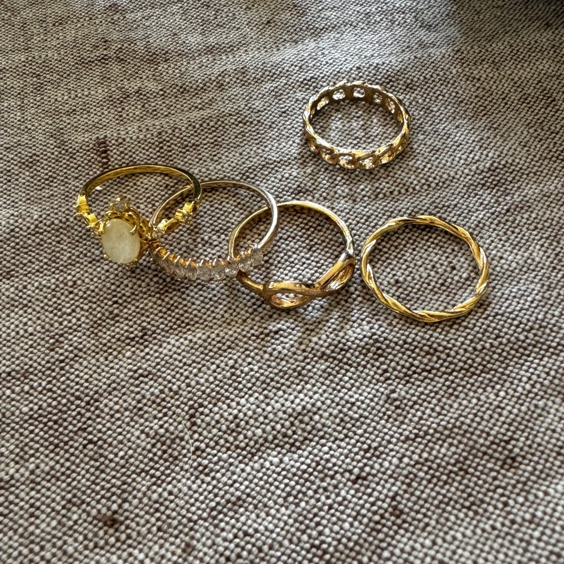 5 st guldfärgade ringar. Inköpta vid olika tillfällen. Använder inte guldfärgade smycken längre, tycker det är synd att de bara ska ligga. Säljes tillsammans trots olika.