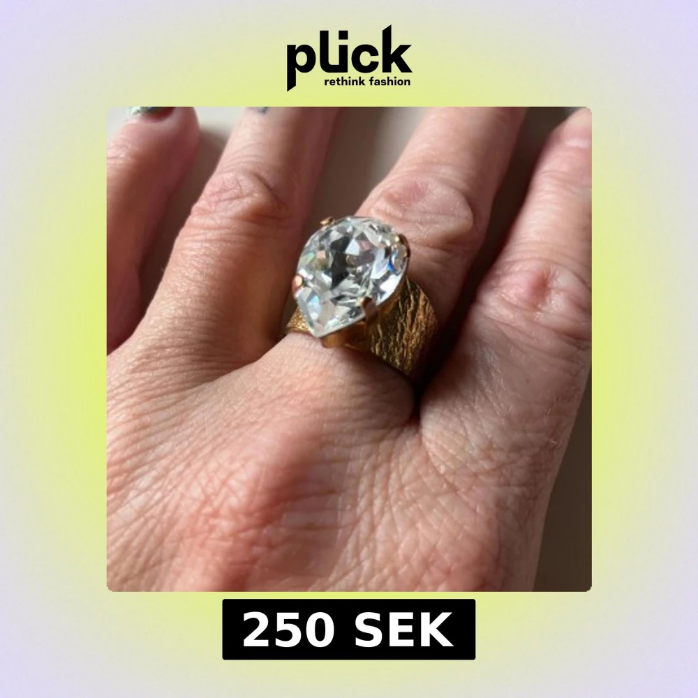 Cool statementring från Caroline Svedbom med bred, hamrad guldfärgad ring och stor, droppformad klar kristall. Ringen är justerbar och har en lyxig känsla som verkligen drar blickarna till sig.