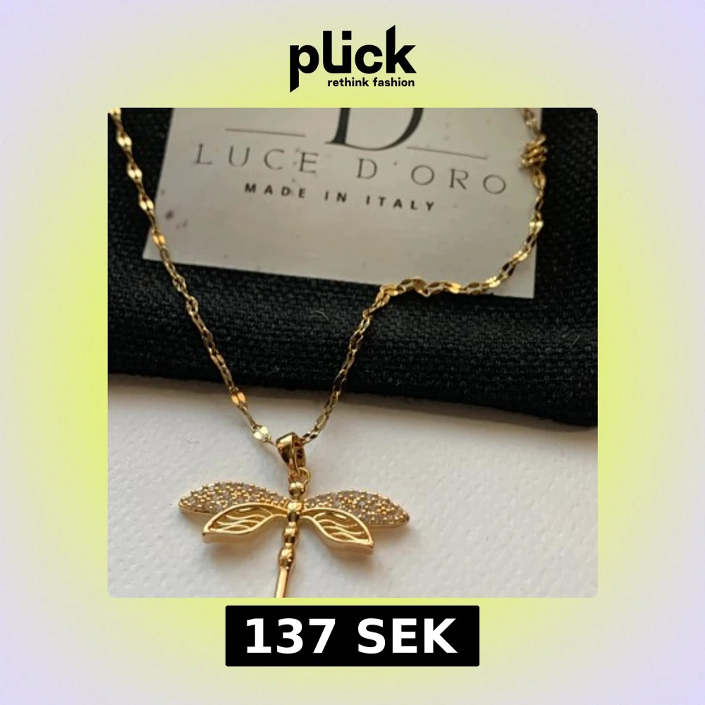 Supersnyggt halsband från Luce D'Oro med guldfärgad kedja och ett hängsmycke i form av en trollslända. Vingarna är dekorerade med små glittrande stenar som ger extra bling. Tillverkat i rostfritt stål och designat i Italien. Perfekt för dig som gillar unika detaljer.