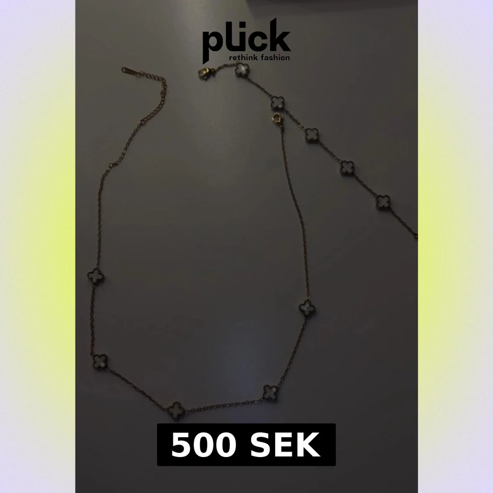 Superfint halsband i guldfärg med små vita fyrklöver-formade hängen längs kedjan. Kedjan är tunn och elegant, och klöverhänget har en pärlram som ger en lyxig känsla. Perfekt för dig som gillar stilrena och trendiga smycken. Rostfri stol