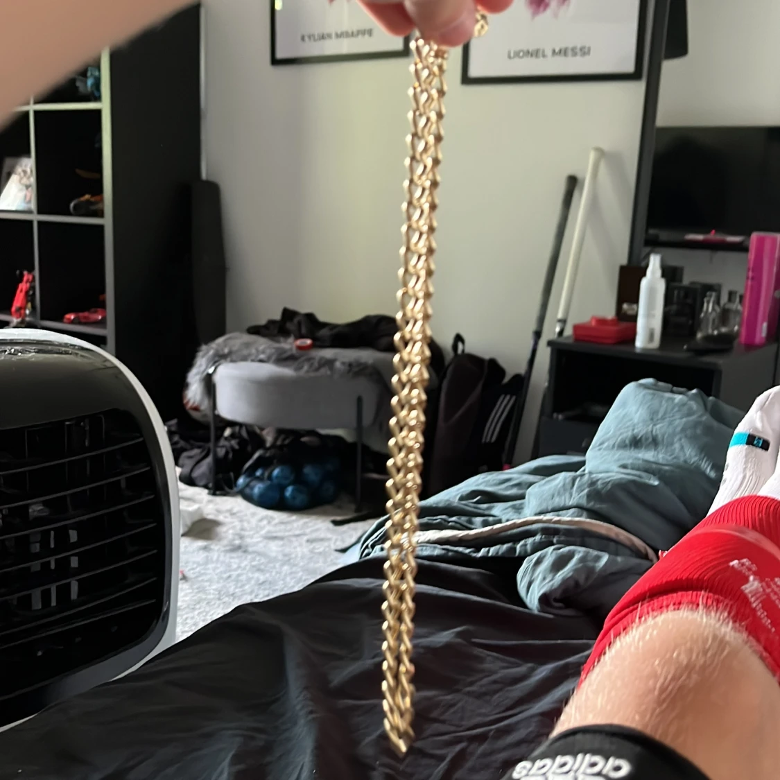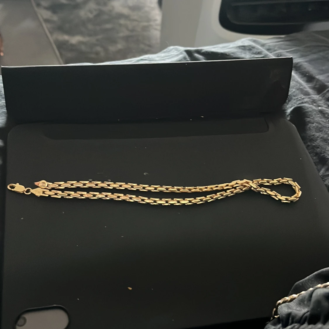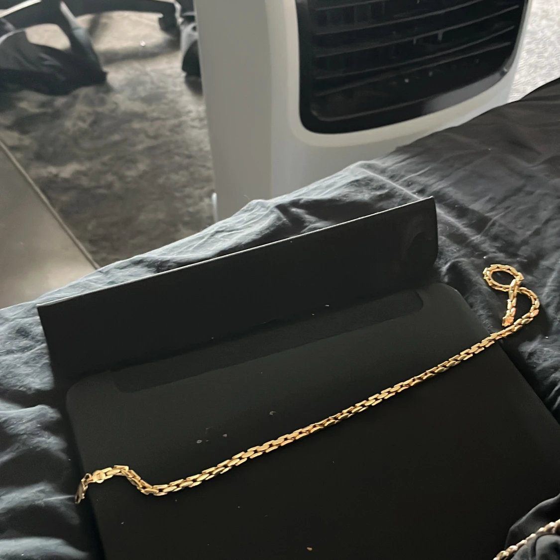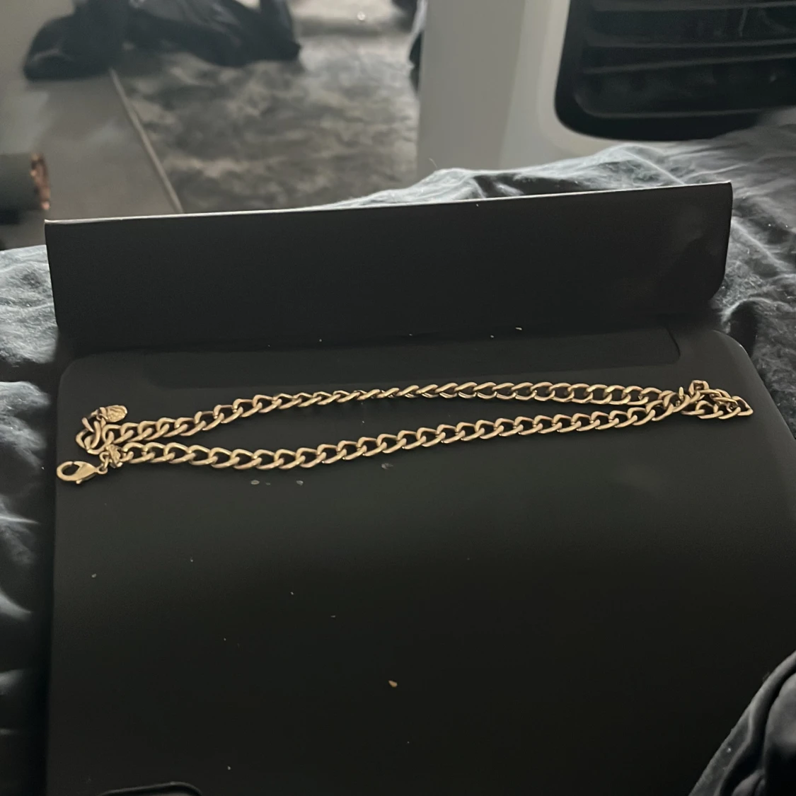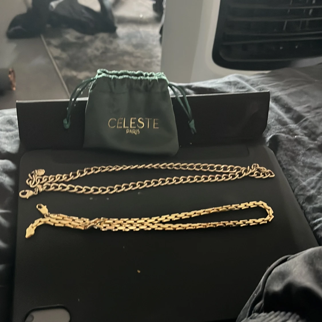Två Snygga halsband och en snygg påse till i guldfärg med klassisk kedjedesign. Länkarna är platta och breda vilket ger ett coolt och stilrent intryck. Perfekt för dig som vill ha en enkel men ändå iögonfallande accessoar. Lås med karbinhake för extra säkerhet.
