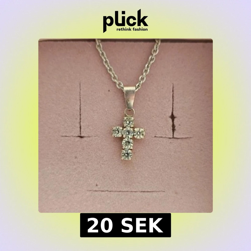 Elegant halsband med ett korsformat hänge dekorerat med glittrande stenar. Kedjan är i silverfärg och har en klassisk design som passar till många tillfällen. Köpt från Guldfynd. Ingen förpackning tillkommer då halsbandet är köpt utan förpackning.