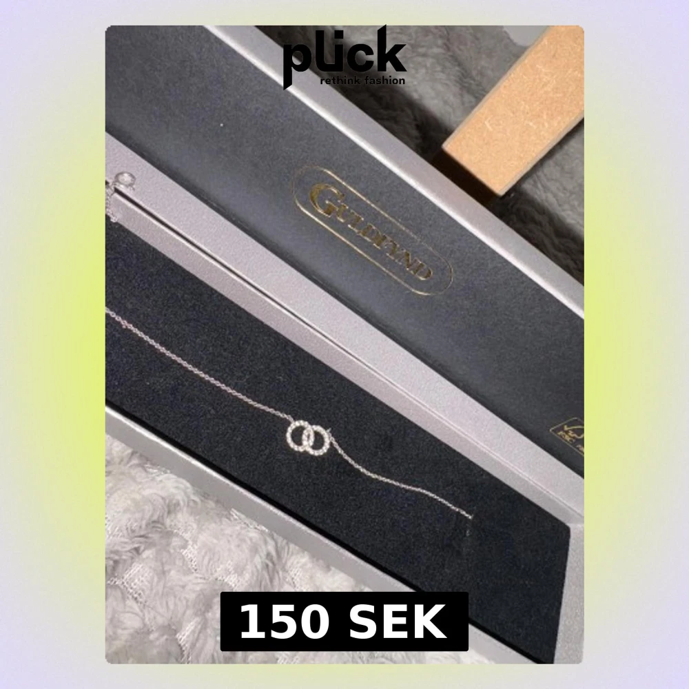 Ett elegant silverhalsband från Guldfynd med två sammanlänkade cirklar dekorerade med gnistrande stenar. Kedjan är tunn och smidig, perfekt för att ge en stilren touch till din look. Kommer i originalask.