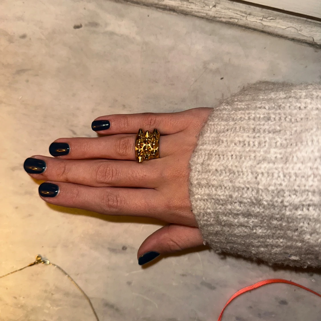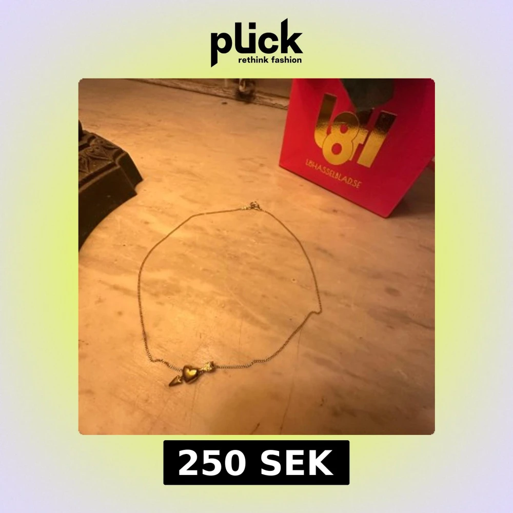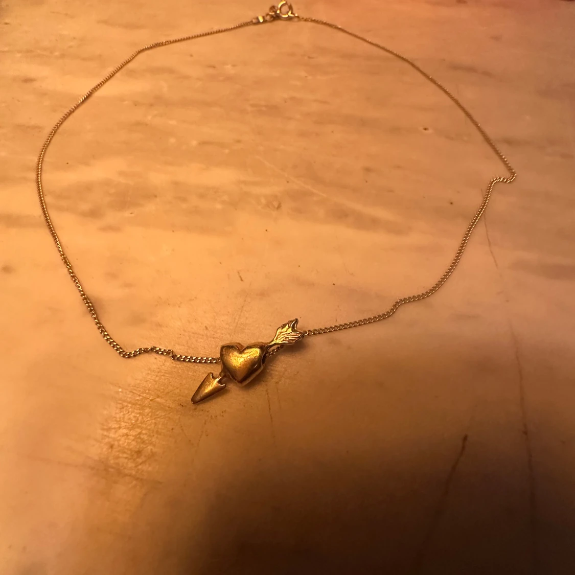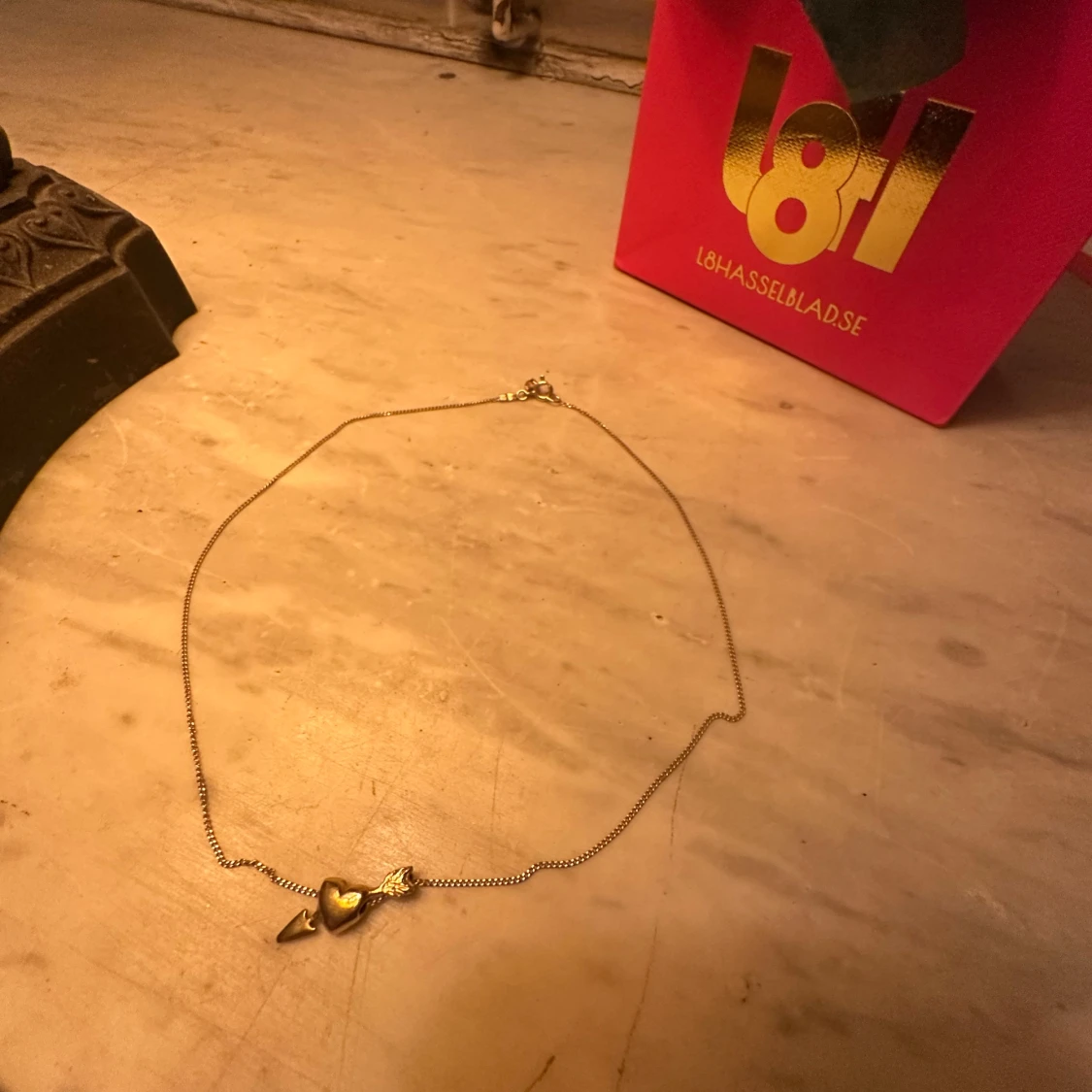 Snyggt guldhalsband med ett hängsmycke i form av ett hjärta genomborrat av en pil. Kedjan är tunn och elegant, perfekt för att ge din look lite extra edge. Märket är L8 Hasselblad, vilket syns på presentpåsen i bakgrunden.