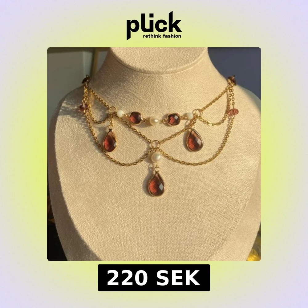 Elegant guldhalsband med hängande röda droppformade stenar och vita pärlor. Kedjan har flera lager och små röda stenar som ger en lyxig känsla. Perfekt för att lyfta vilken outfit som helst.