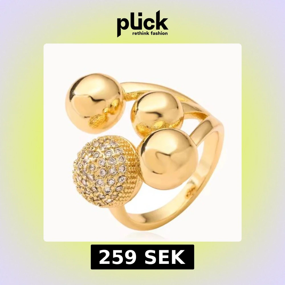 Cool ring i guldton med fyra stora klot, varav ett är täckt av glittrande stenar. Ringen har en unik och modern design som verkligen sticker ut. Perfekt för dig som vill ha ett smycke som syns och ger extra bling till din stil.