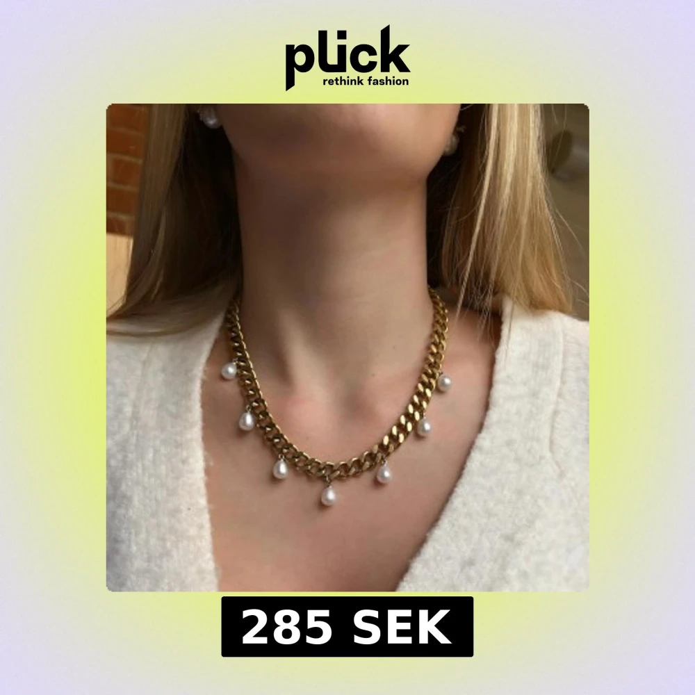 Matchande örhängen finns i en separat annons Finns även i silverfärg Material: 18K guldplätering på rostfritt stål Bredd: 9 mm Längd: 38-43cm Nickelfria och handgjorda.