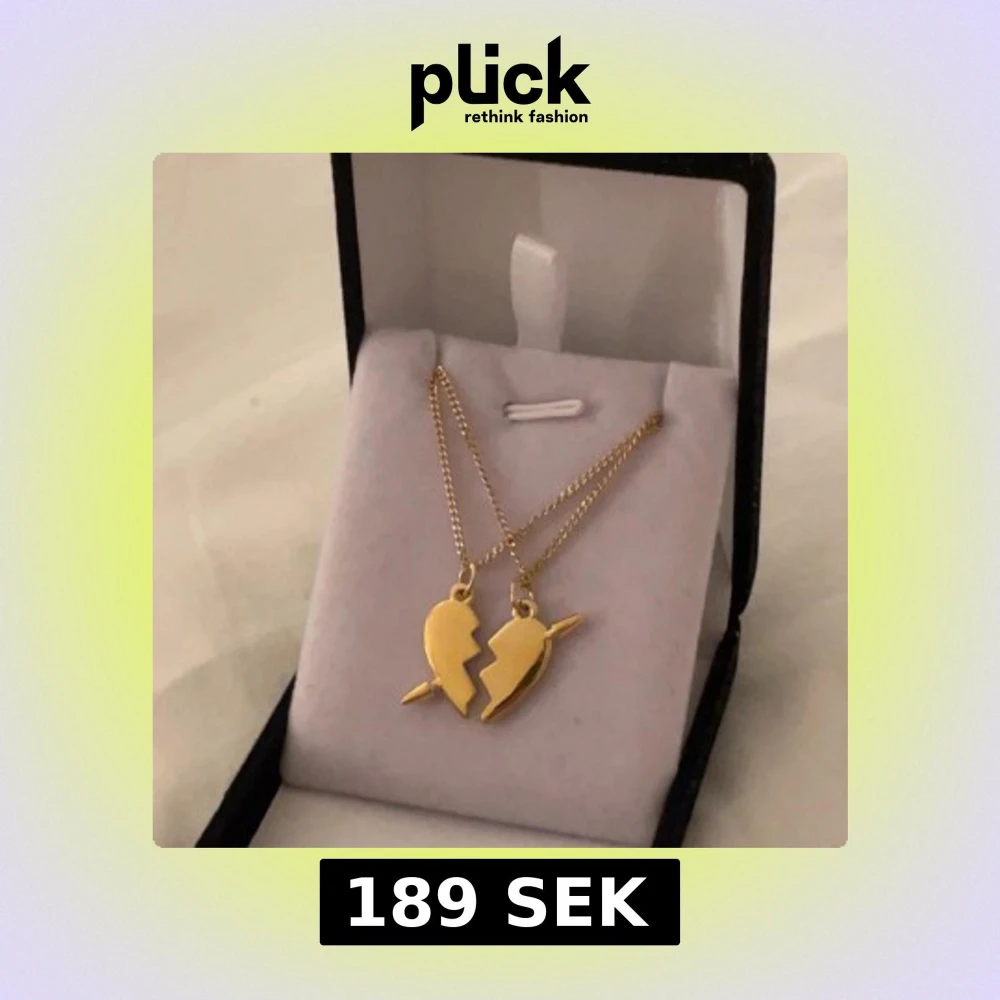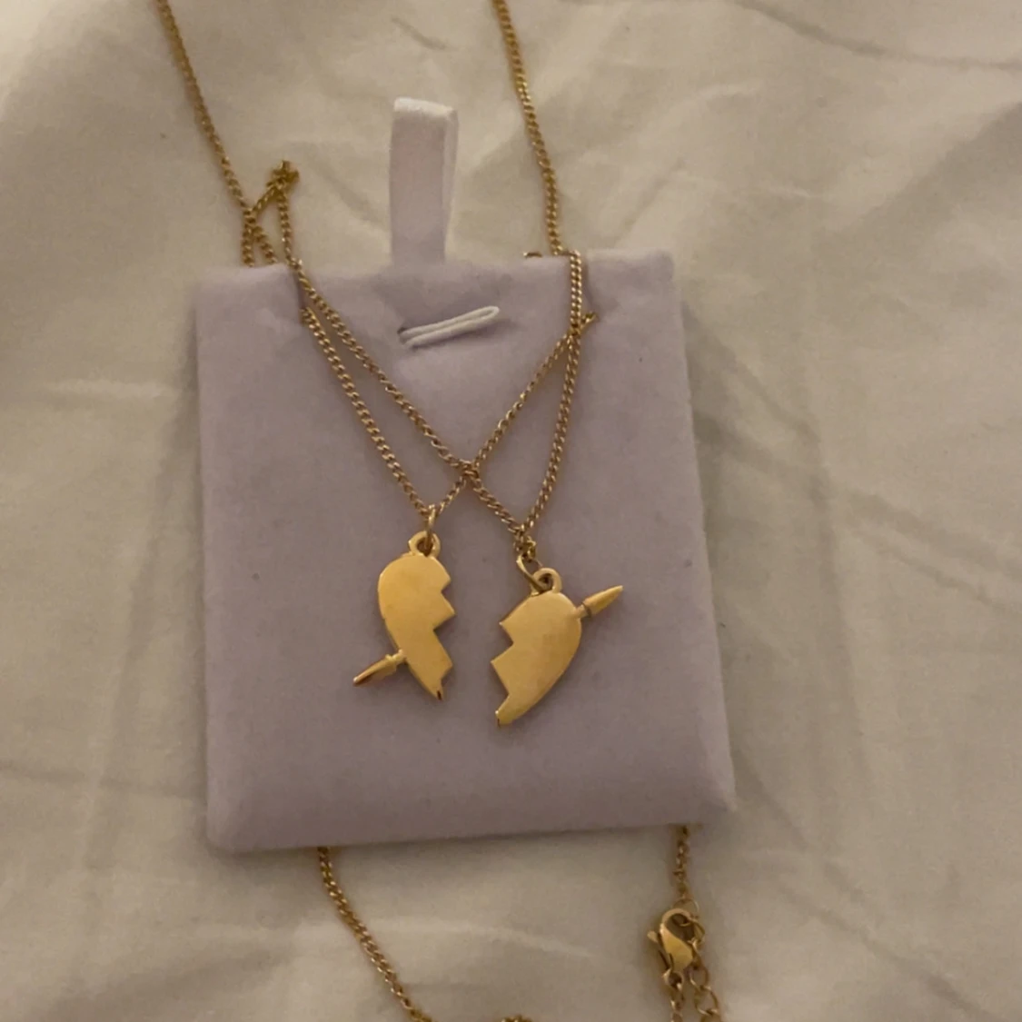 Två guldiga halsband med matchande hängen i form av ett delat hjärta, där varje del har en pil genom sig. Perfekt som vänskapshalsband eller för att dela med någon speciell. Kedjorna är tunna och eleganta, och hjärthängena har en cool, kantig design.