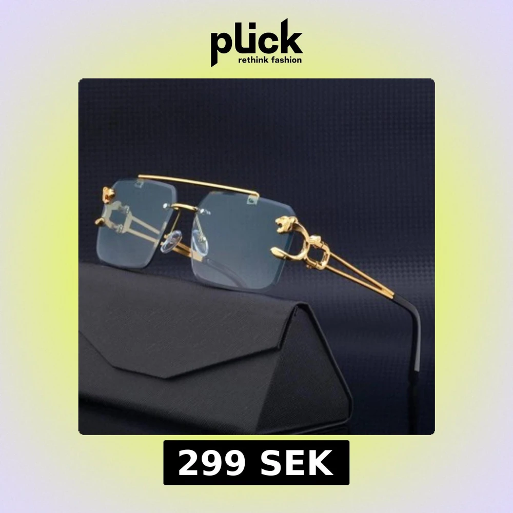 Unika kantlösa glasögon med fyrkantiga blåtonade linser och detaljerade guldfärgade skalmar med panterhuvuden. Snygg och lyxig design som sticker ut, perfekt för dig som vill ha något extra. Säljes med svart fodral. PRISET KAN DISKUTERAS!