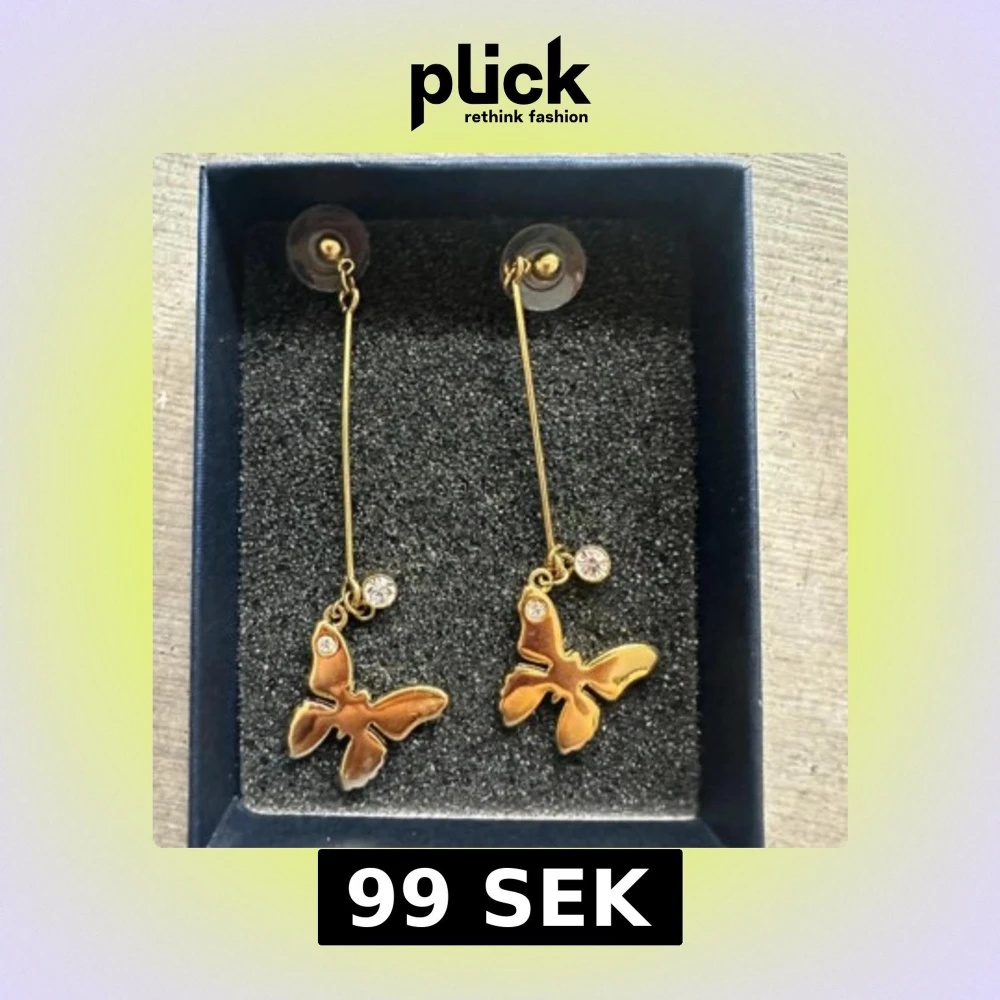 Snygga långa örhängen i guld med hängande fjärilar och små glittrande stenar. Perfekta för dig som vill sticka ut med en cool och trendig accessoar. Fjärilarna ger en lekfull vibe och de gnistrande detaljerna gör dem extra speciella.