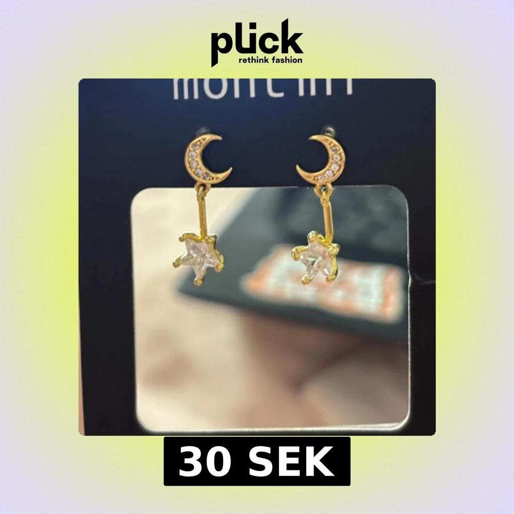 Supersöta örhängen i guldton med små gnistrande månar och hängande stjärnor i klar sten.