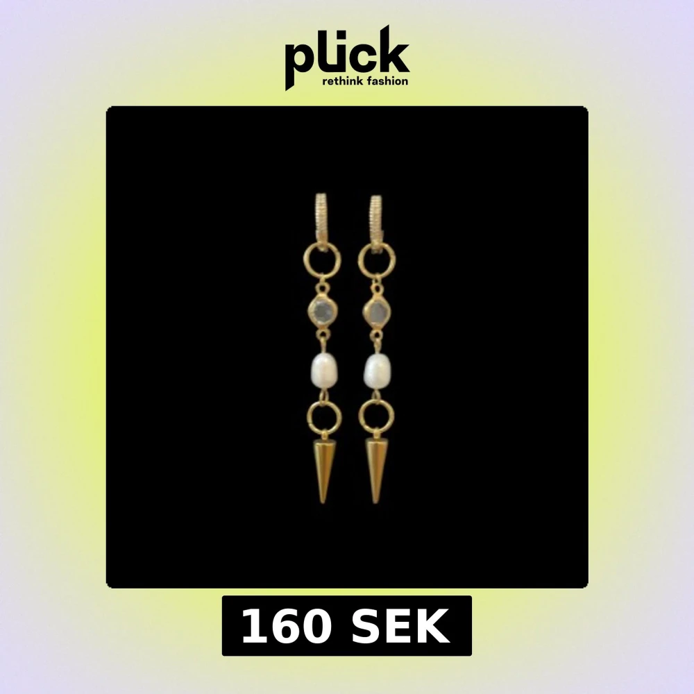 Snygga guldiga örhängen med hängande detaljer. De har vita pärlor, små genomskinliga stenar och avslutas med en cool guldfärgad kon längst ner. Perfekta för att ge din look lite edge och elegans.