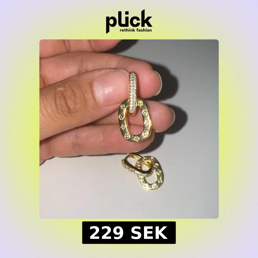 Snygga örhängen i guldton med oval form och gnistrande stenar på öglan. Den större länken har ingraverade liknande symboler för en lyxig vibe. Perfekta för dig som vill sticka ut med exklusiv känsla.