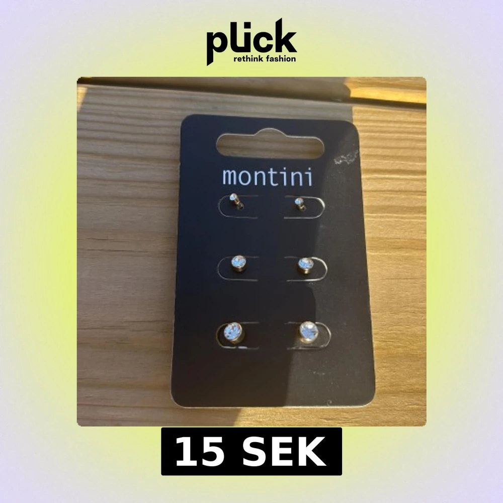 Säljer ett set med sex guldiga örhängen från Montini, alla med glittrande vita strasstenar i olika storlekar. Perfekt för att mixa och matcha flera hål i öronen.