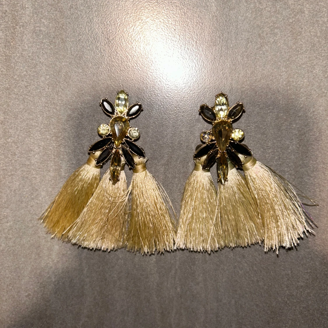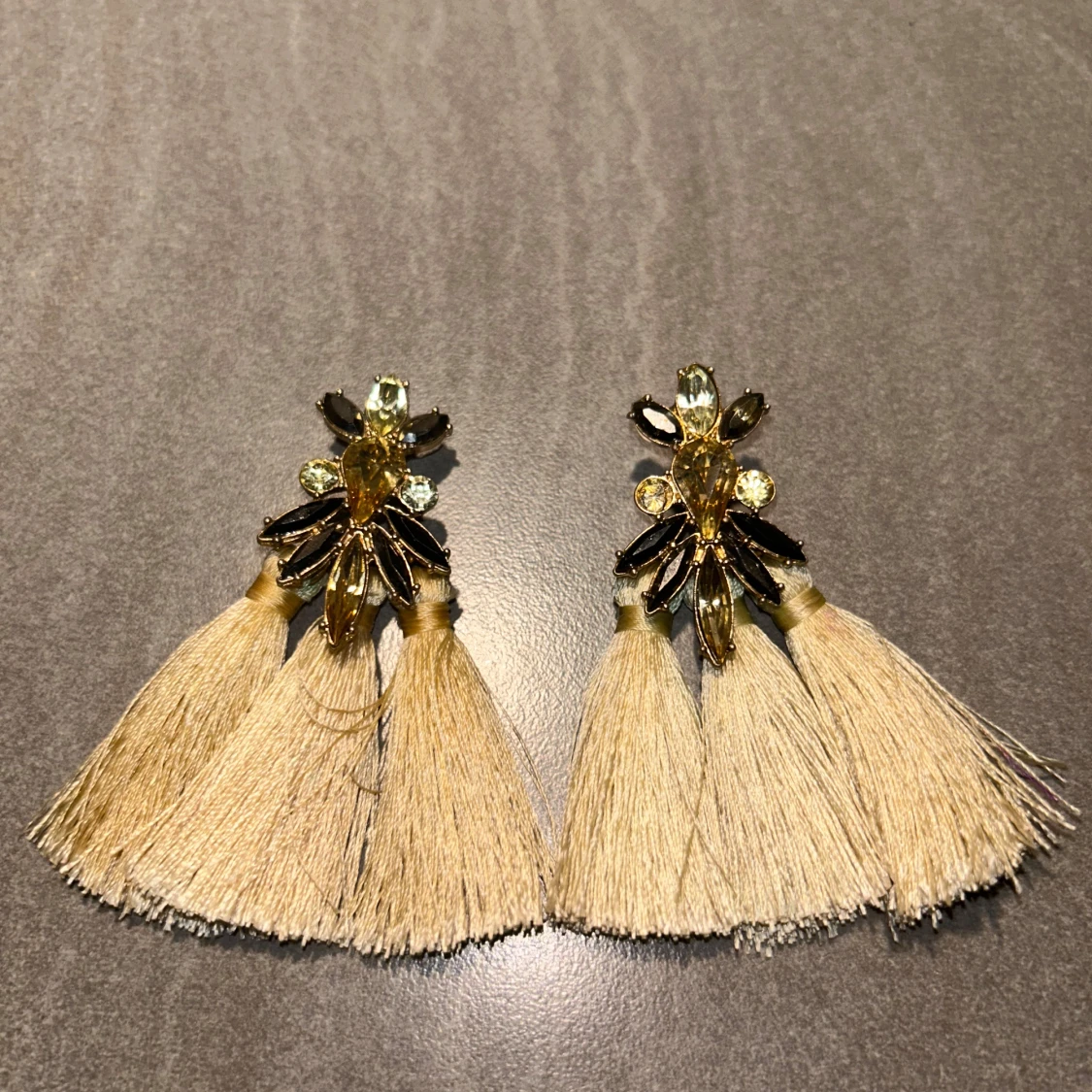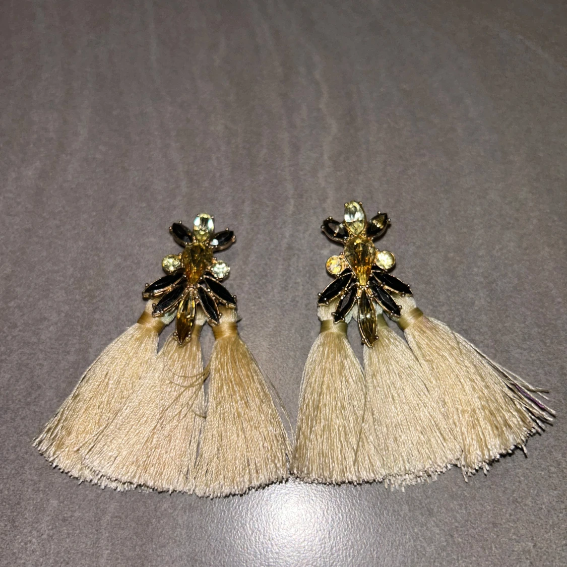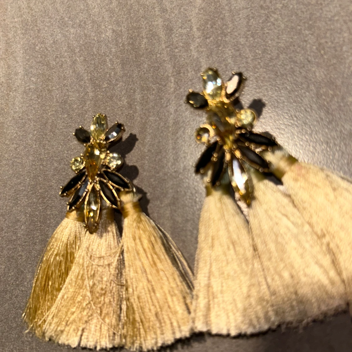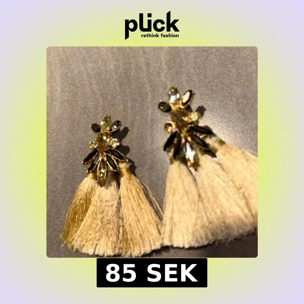 Unika örhängen med guldiga detaljer, glittrande stenar och stora ljusbeiga tofsar. Örhängena har en cool design med flera gnistrande stenar i olika former och långa, mjuka tofsar som ger ett statement-utseende. Perfekta för dig som vill sticka ut.