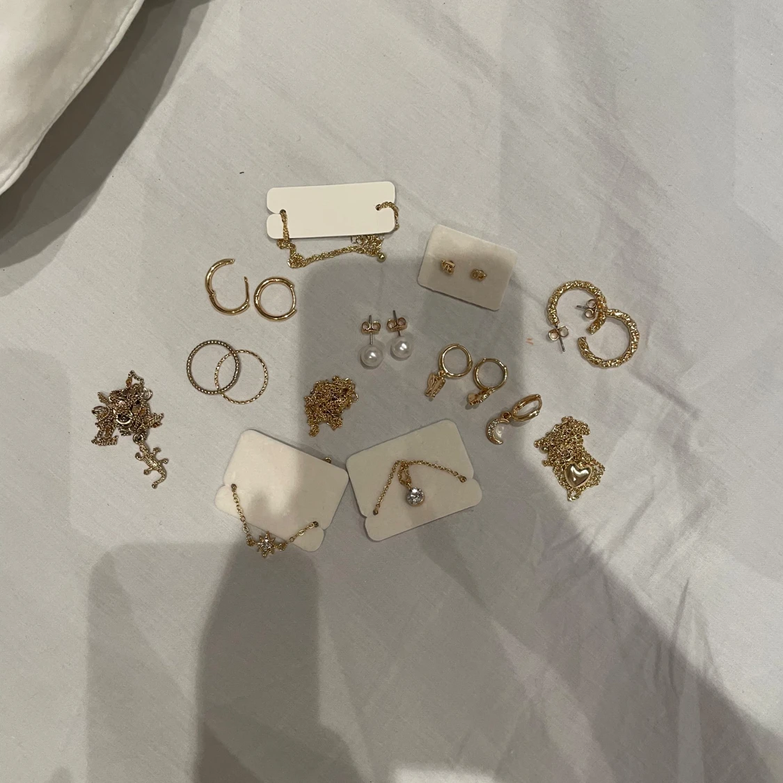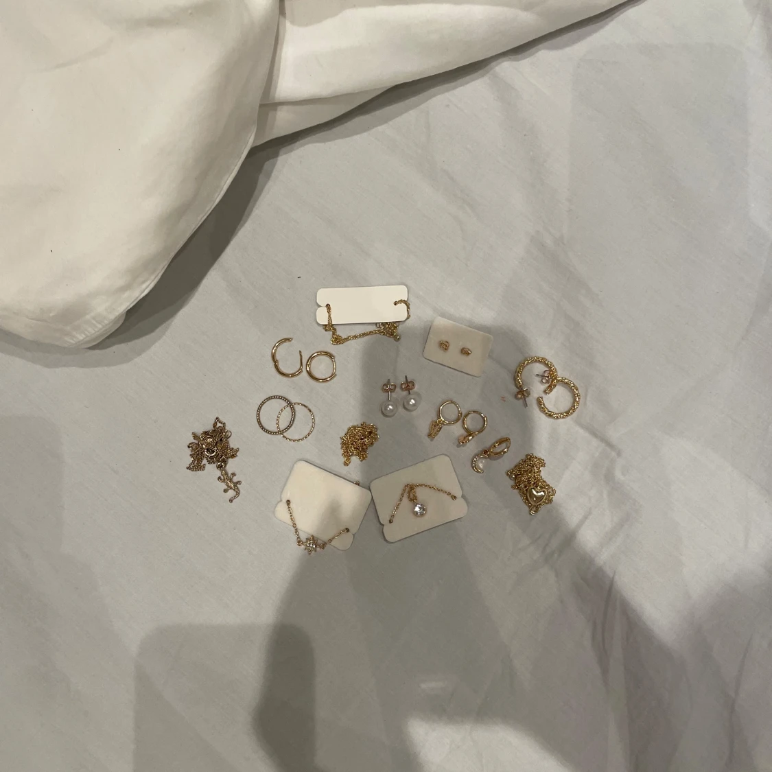 Massa olika guldiga smycken. Säljer detta: 4 halsband, 2 armband, 2 ringar, 5 par örhängen och ett enstaka örhänge. Allt köpt samtidigt. och det mesta är inte andvänt.