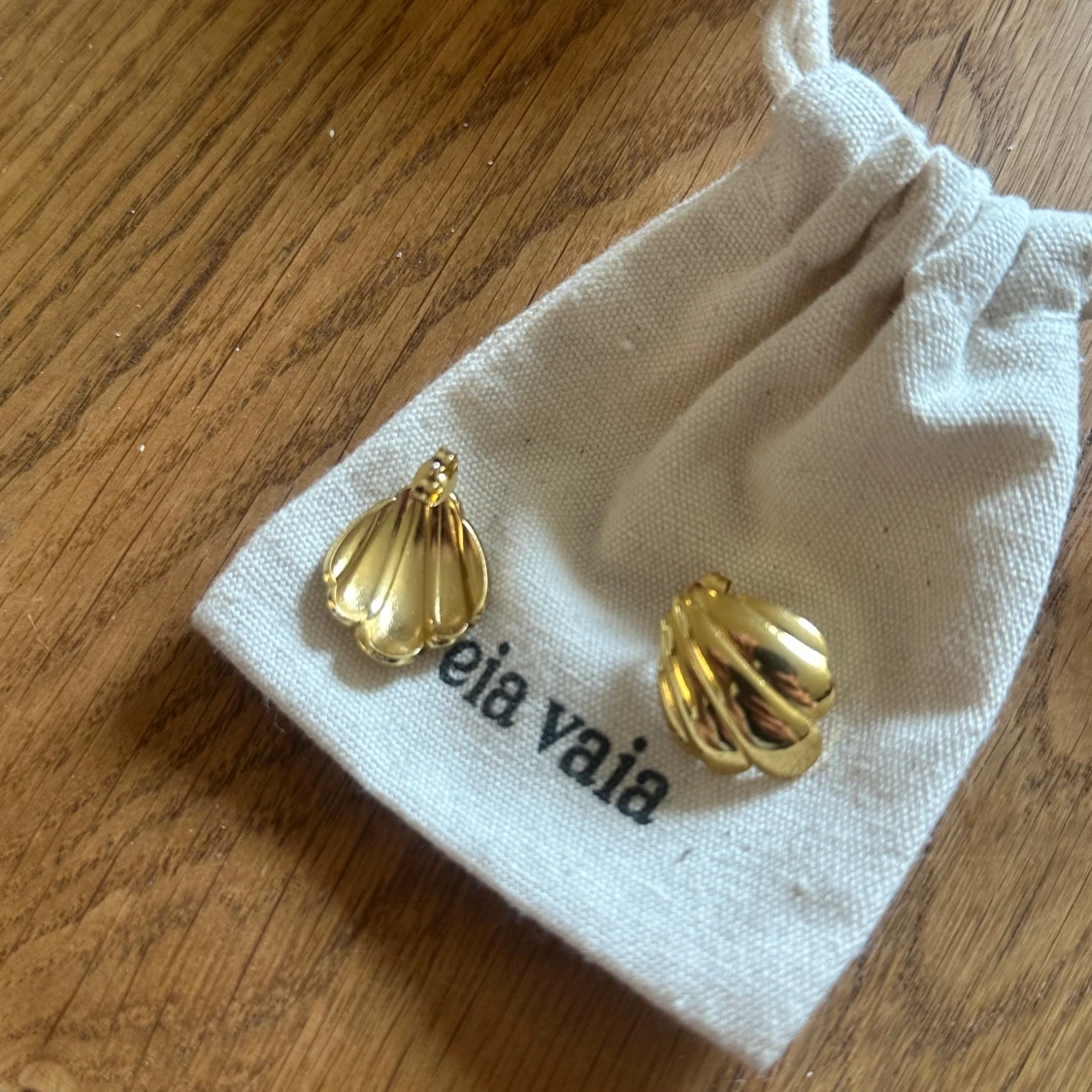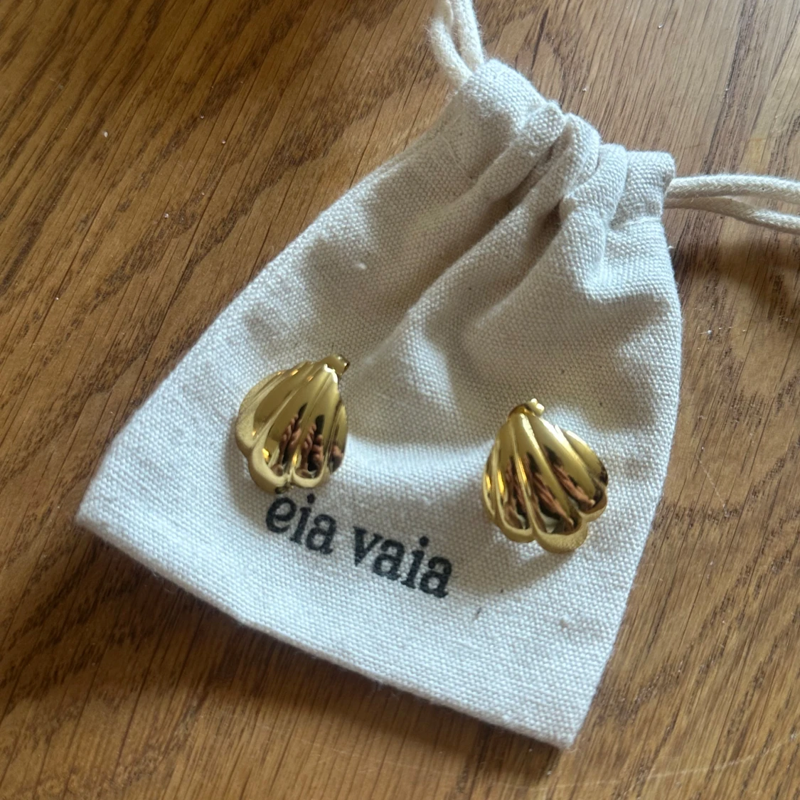 Snygga örhängen i snäckform från Eia Vaia. De är i blank guldfärg och har en cool, skulptural design som verkligen sticker ut. Perfekta för dig som vill ha något unikt och trendigt i smyckeslådan.
