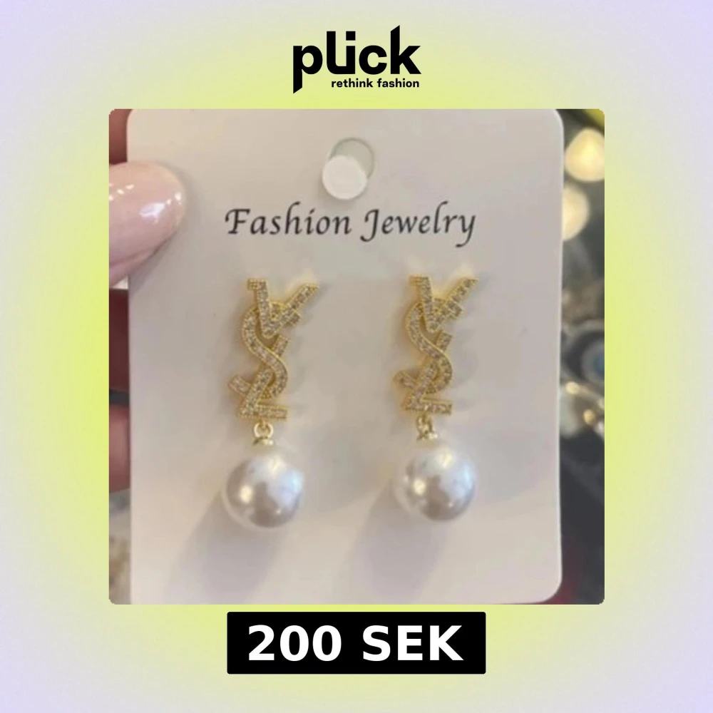 Snygga örhängen i guld med YSL-logga och hängande vita pärlor. Loggan är glittrig och ger en lyxig känsla, medan pärlorna ger en klassisk touch. Perfekta för att lyfta vilken outfit som helst.