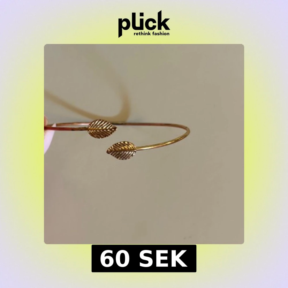 Snyggt och minimalistiskt armband i guldton med två detaljerade löv i ändarna. Armbandet är tunt och öppet, vilket gör det enkelt att ta på och av. Perfekt accessoar för att ge din outfit en naturell och trendig touch. Bra skick. Onesize