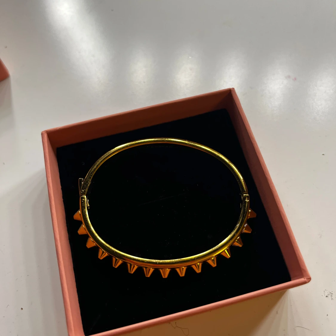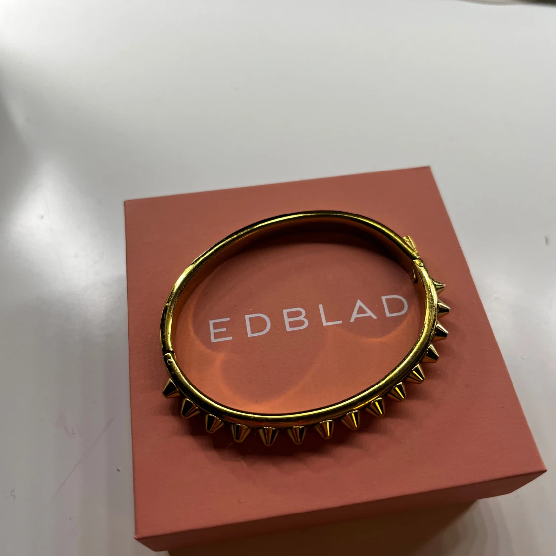 Coolt armband från Edblad i guldton med spetsiga nitar runt hela bandet. Perfekt accessoar för att ge din outfit en edgy vibe. Stängs med smidig låsning och kommer i original ask. Orginalpris är 599, knappt använd. Skriv vid fler frågor🥰