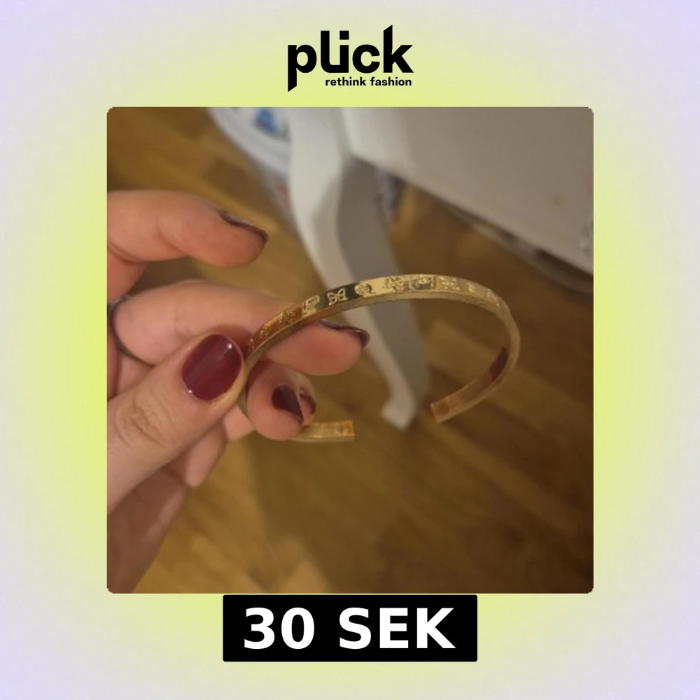 Snyggt och stilrent guldigt armband i metall med ingraverade små symboler som rosetter, stjärnor och hjärtan längs hela bandet. Armbandet är öppet och har en tunn, minimalistisk design som passar perfekt för att ge din outfit lite extra edge.