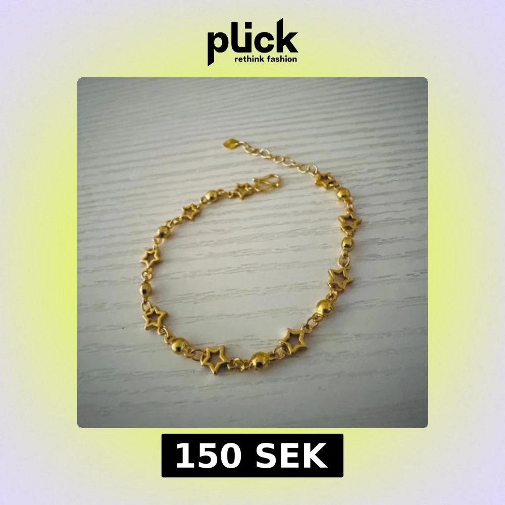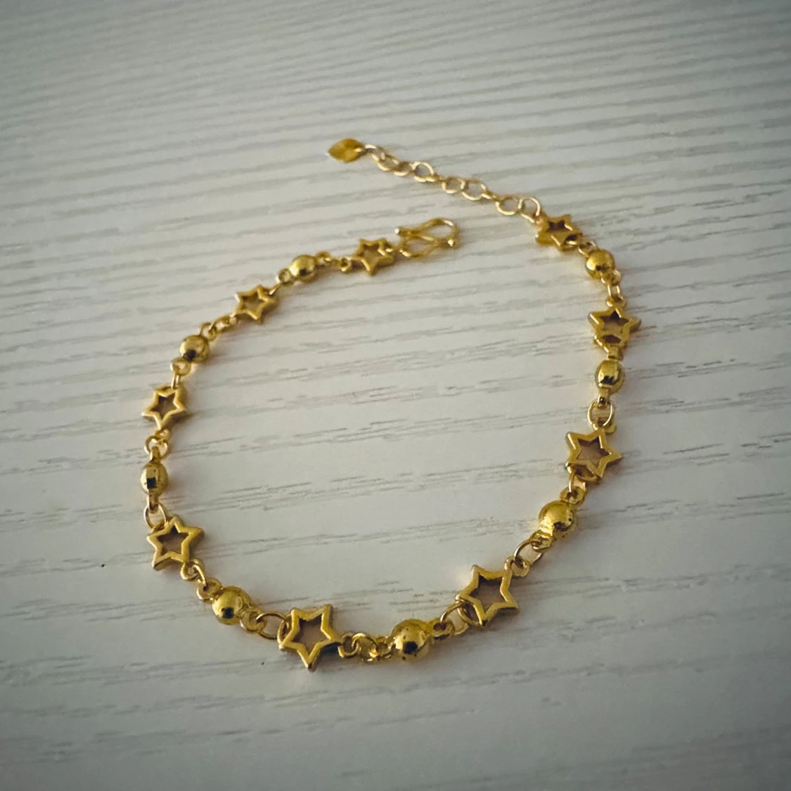 Snyggt armband i guldton med små stjärnformade länkar och runda pärlor. Justerbar längd med kedja och karbinlås. Perfekt för dig som gillar detaljer med lite extra glans och unik form.