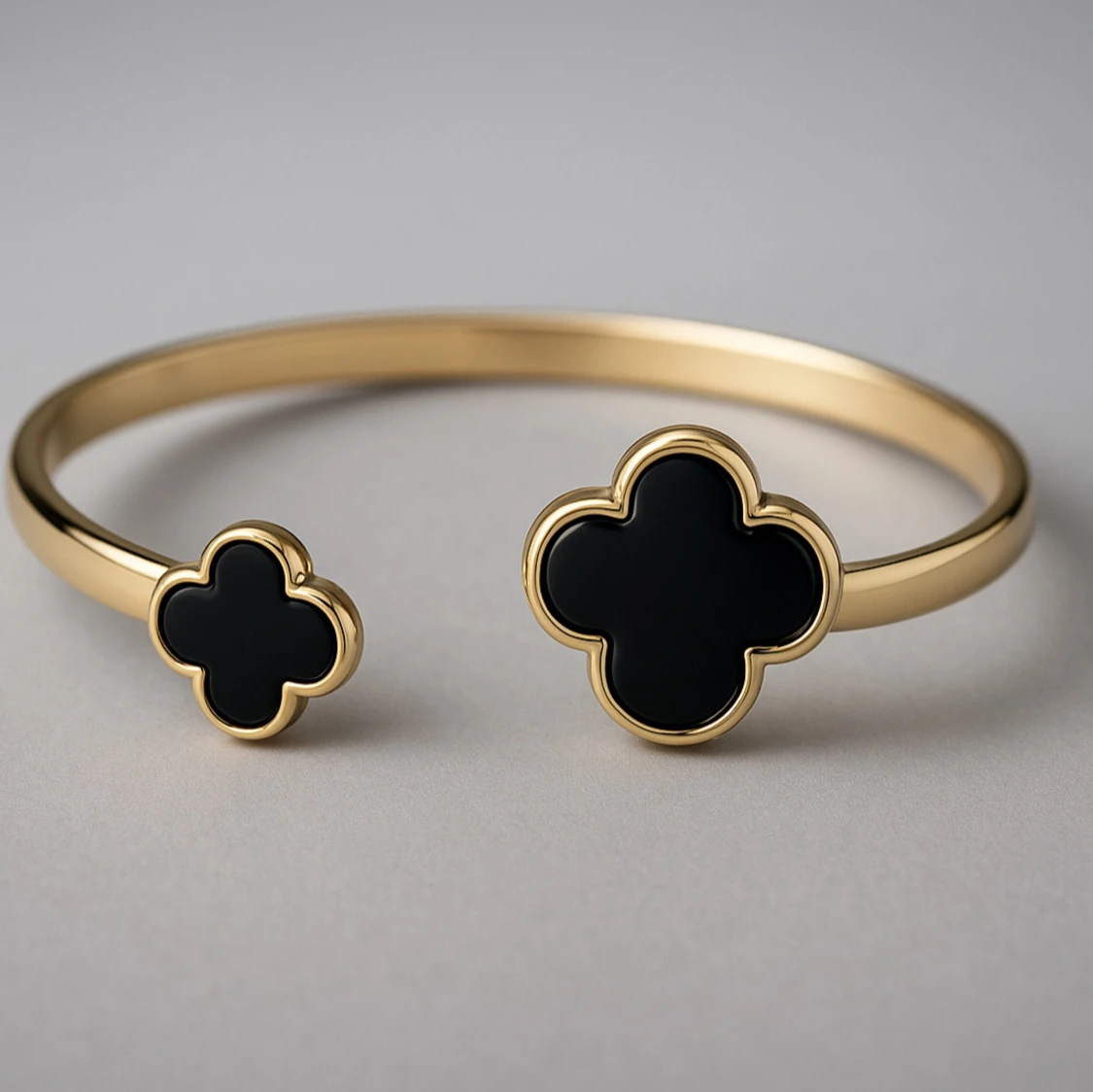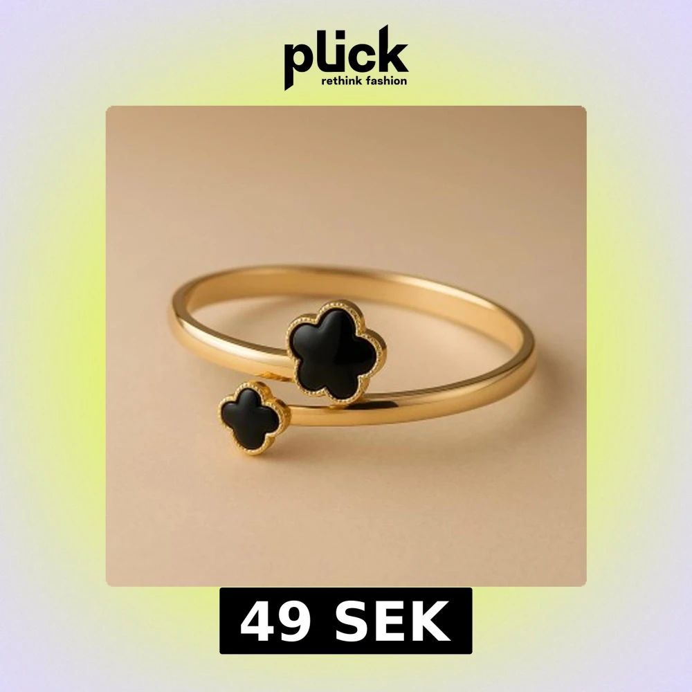 Snyggt guldigt armband med två svarta blommor i klöverformade detaljer. Perfekt accessoar för att lyfta din outfit med en cool och trendig touch. Armbandet har en stilren och modern design som passar dig som gillar att sticka ut.