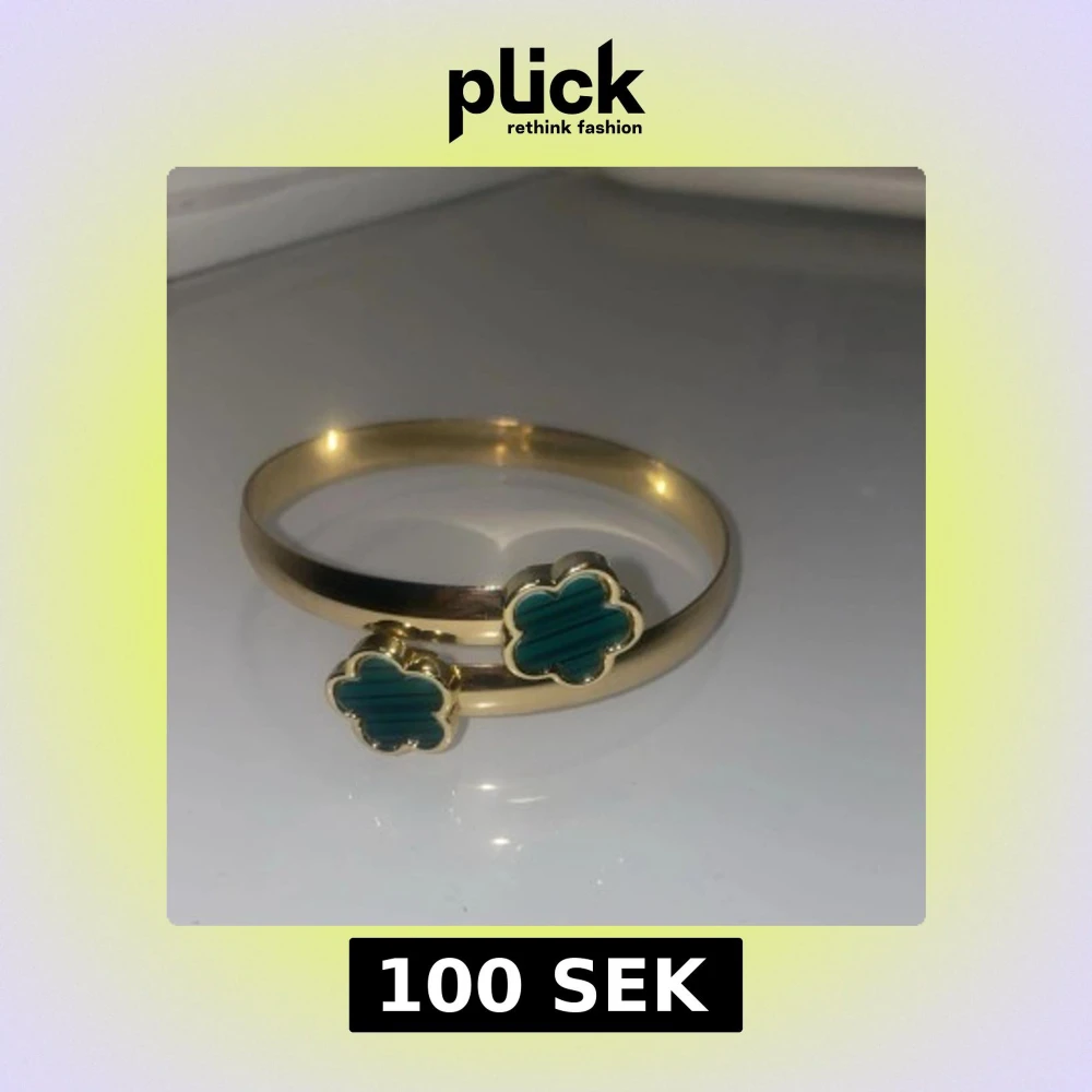 Snyggt set med armband och örhängen i guldton med gröna blommor i fyrklöverform. Blommorna har en randig effekt i det gröna och ger en cool, unik look. Perfekt för dig som vill sticka ut med detaljer som känns både trendiga och klassiska. Aldrig använda. 🌸
