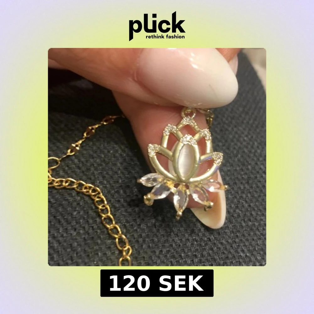 Unikt halsband från Fossil i guldton med en lotusformad berlock. Berlocken har gnistrande stenar och en vit pärlemorliknande detalj i mitten. Kedjan är tunn och elegant, perfekt för att ge din look en extra touch av stil.