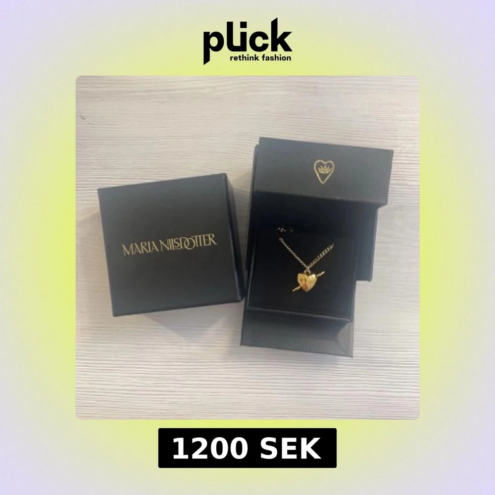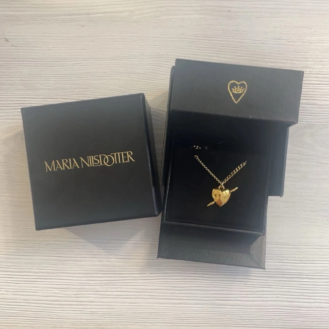 Snyggt halsband från Maria Nilsdotter i guld med ett hjärtformat hänge och pil-detalj. Kedjan är klassisk och passar perfekt till dig som gillar unika smycken med cool design. Levereras i original ask.