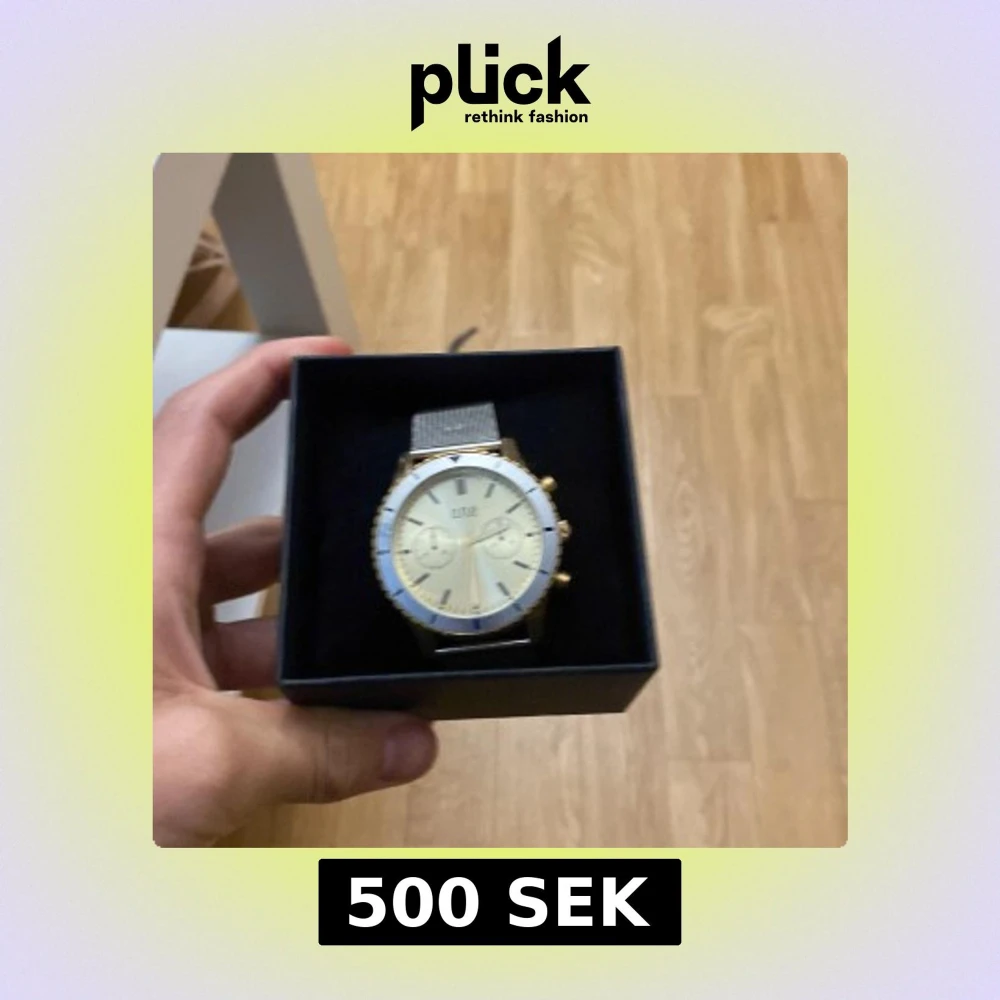 En guldklocka märke ONE, man får med en box för klockan. Klockans bandstorlek går att ändra enkelt på klockan