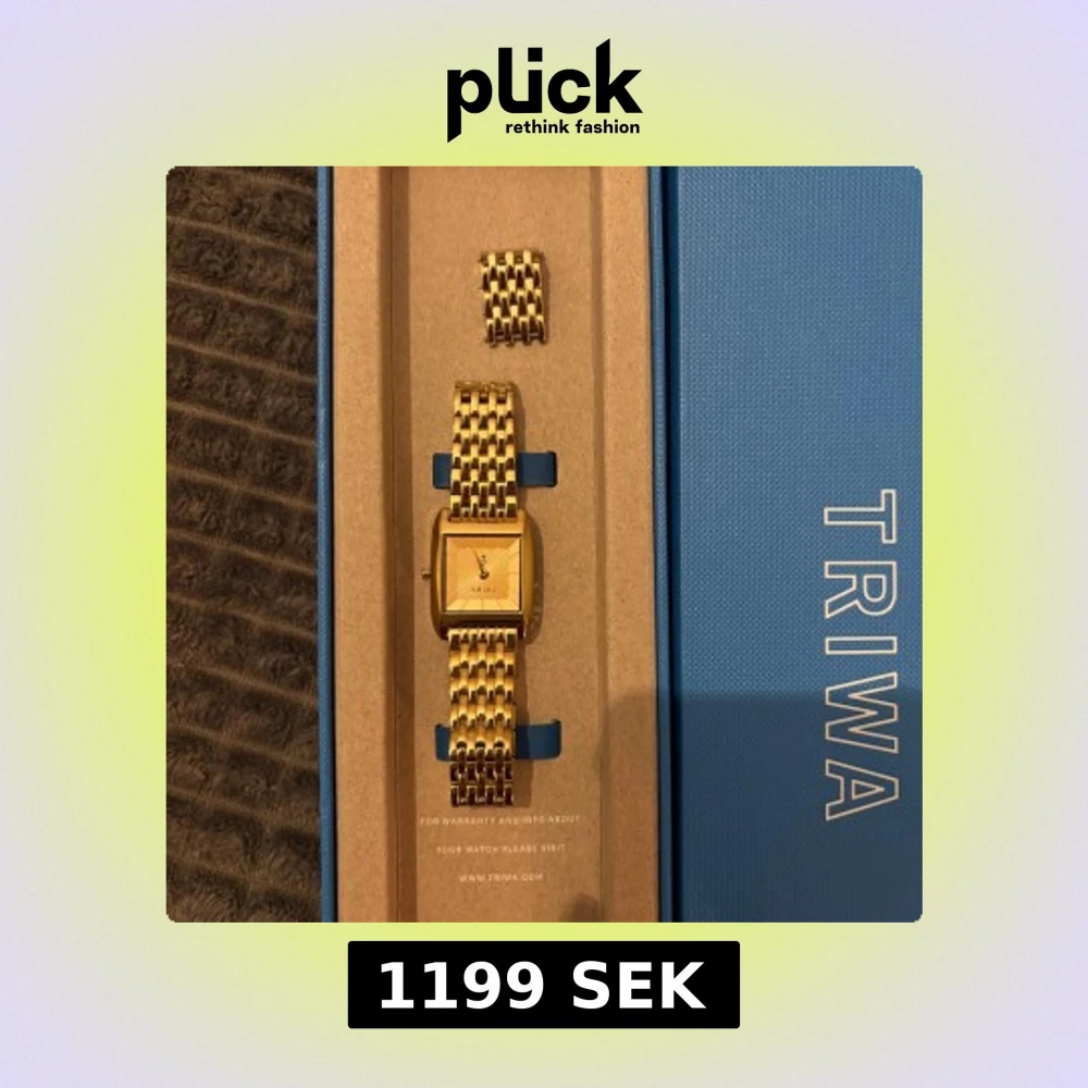 Säljer en stilren Triwa klocka med en vacker guldfärgad design. Klockan har en rektangulär urtavla med Triwas logotyp och en feminin symbol. Armbandet är också guldfärgat och har en klassisk länkdesign. Ett extra armband medföljer. Använd ett par gånger, väldigt fint skick! Nypris: 1995:- Mer info finns på Triwas hemsida