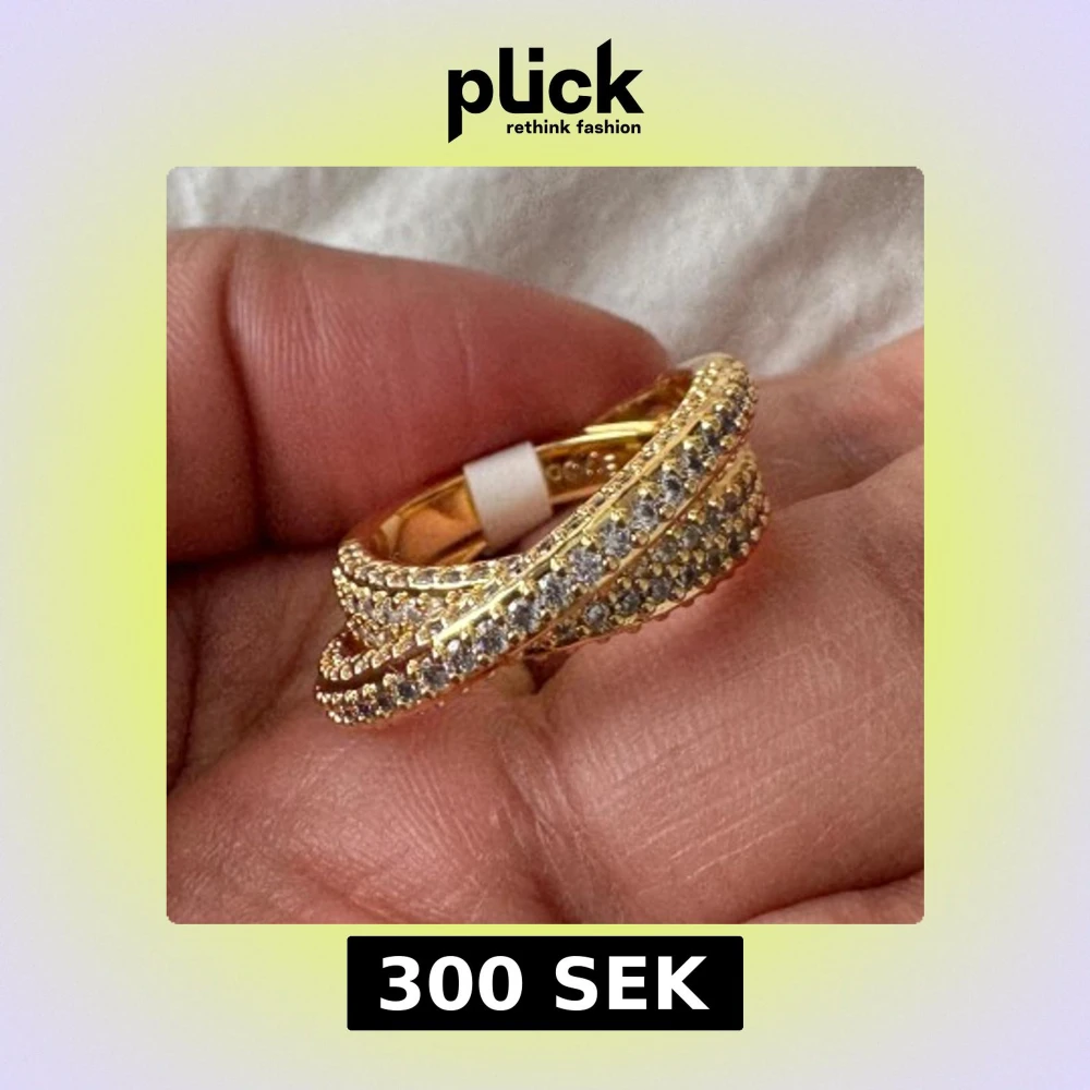 Detta var en present till en vän, men den var tyvärr för stor. Helt oanvänd i storlek 17 mm. Snygg twistad guldpläterad ring från by Jolima med glittrande stenar. Ringen har en cool korsad design som verkligen sticker ut och ger en lyxig känsla. Så fin! Nypris, 499 SEK