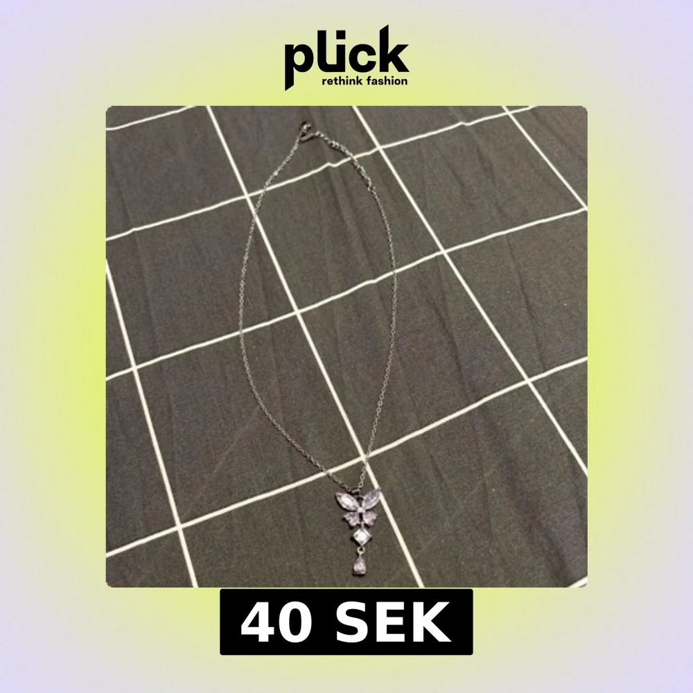Snyggt halsband i silverfärgad med ett hänge som liknar en fjäril, dekorerat med lila stenar i olika former. (Inte äkta silver)