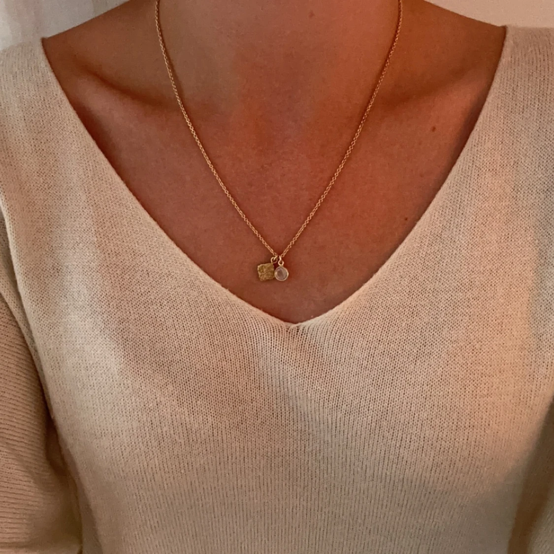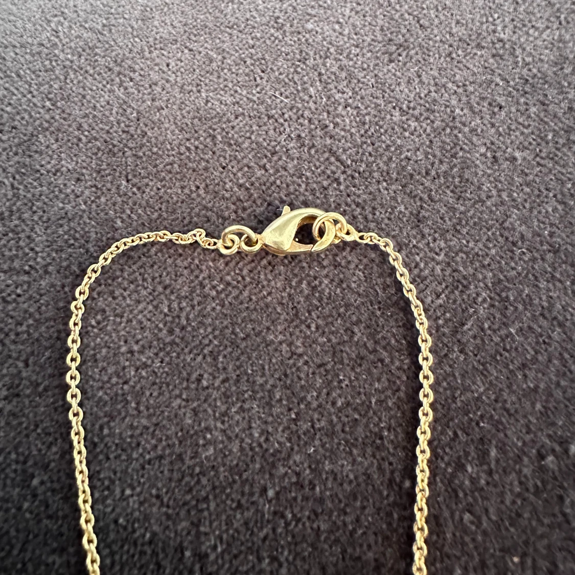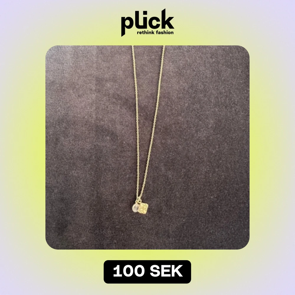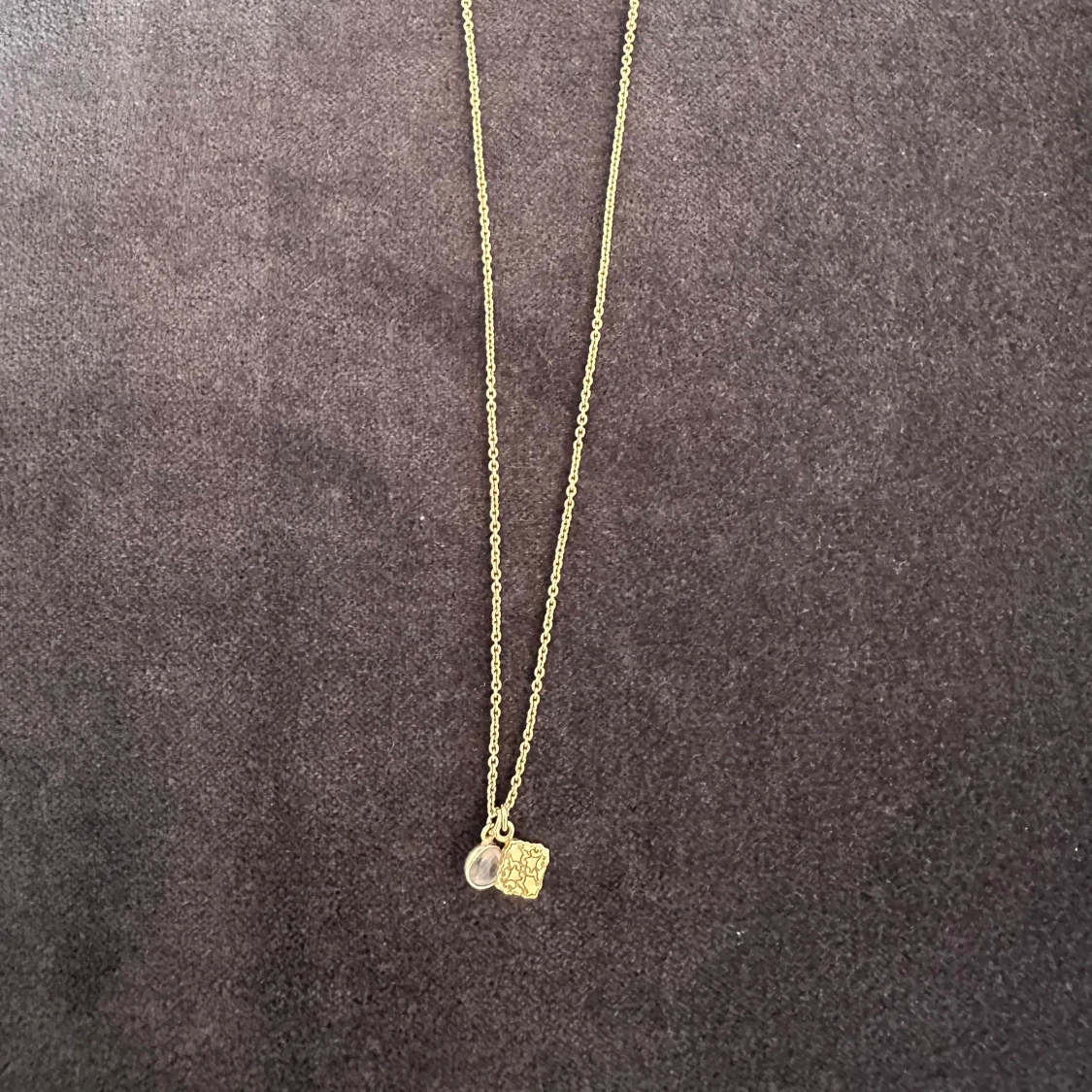 Guldfärgat halsband med två berlocker (en sten och en kvadratformad med kartliknande motiv). Bra skick, ask medföljer. Kedjans längd: 45 cm