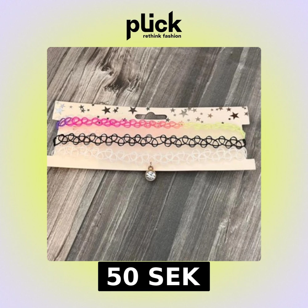 Säljer ett set med tre choker-halsband i olika färger. Ett av halsbanden har en glittrig berlock i guldfärg. Köpt på glitter för några år sedan och har aldrig ens tagit av från kartongen