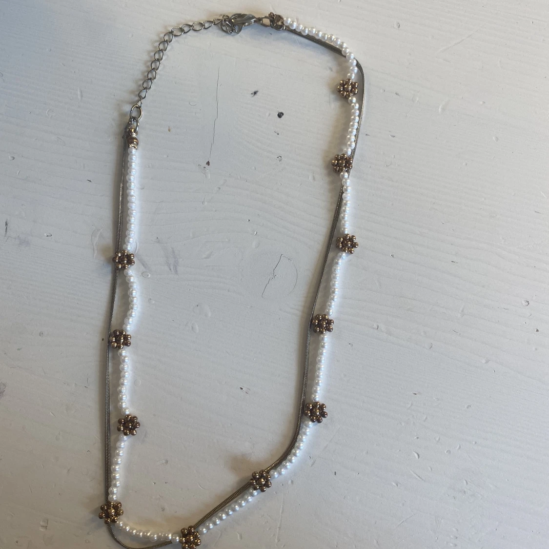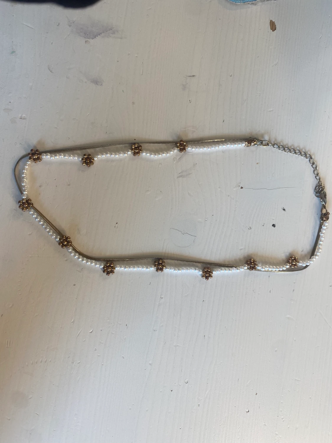Ett guld halsband med 11 blommor och pärlor på. Perfekt för sommarn