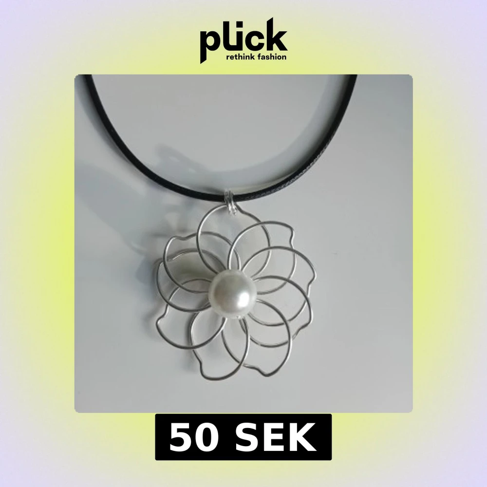 Handgjord halsband format som en blomma gjort med silverfärgad aluminiumtråd. Blir en söt accessoar. Blomman är ca 4cm stort. Kedjan är justerbar på halsbandet.