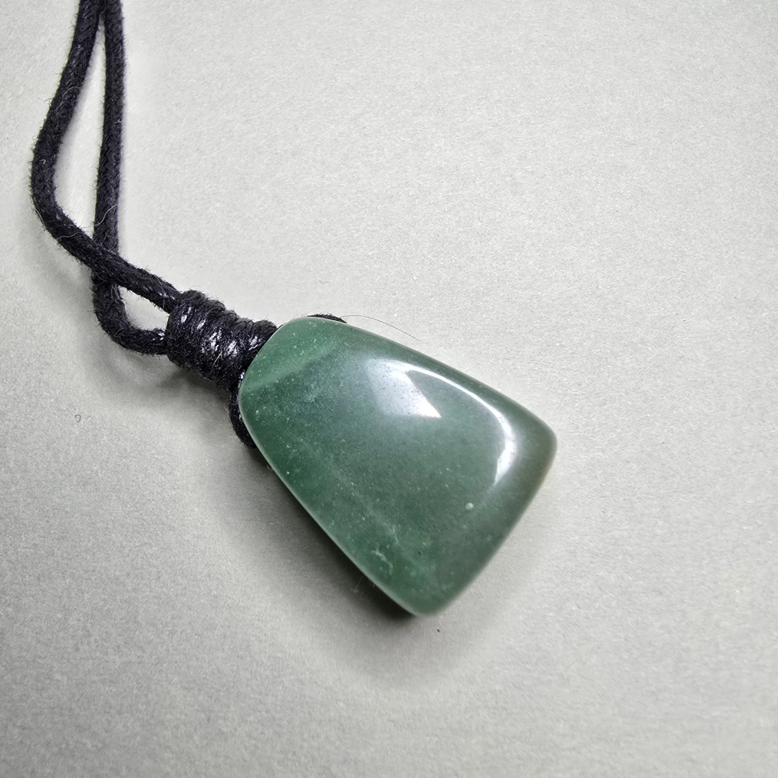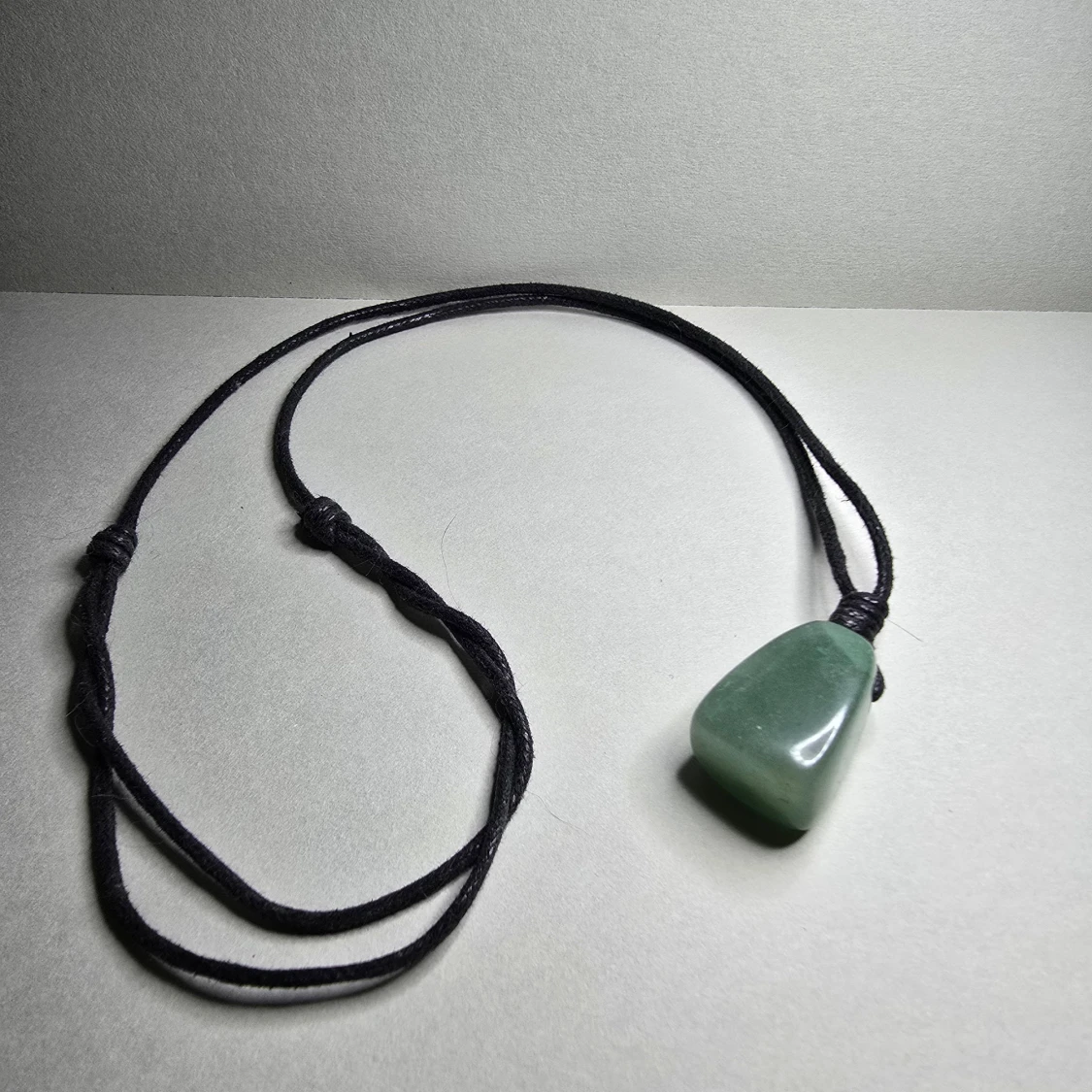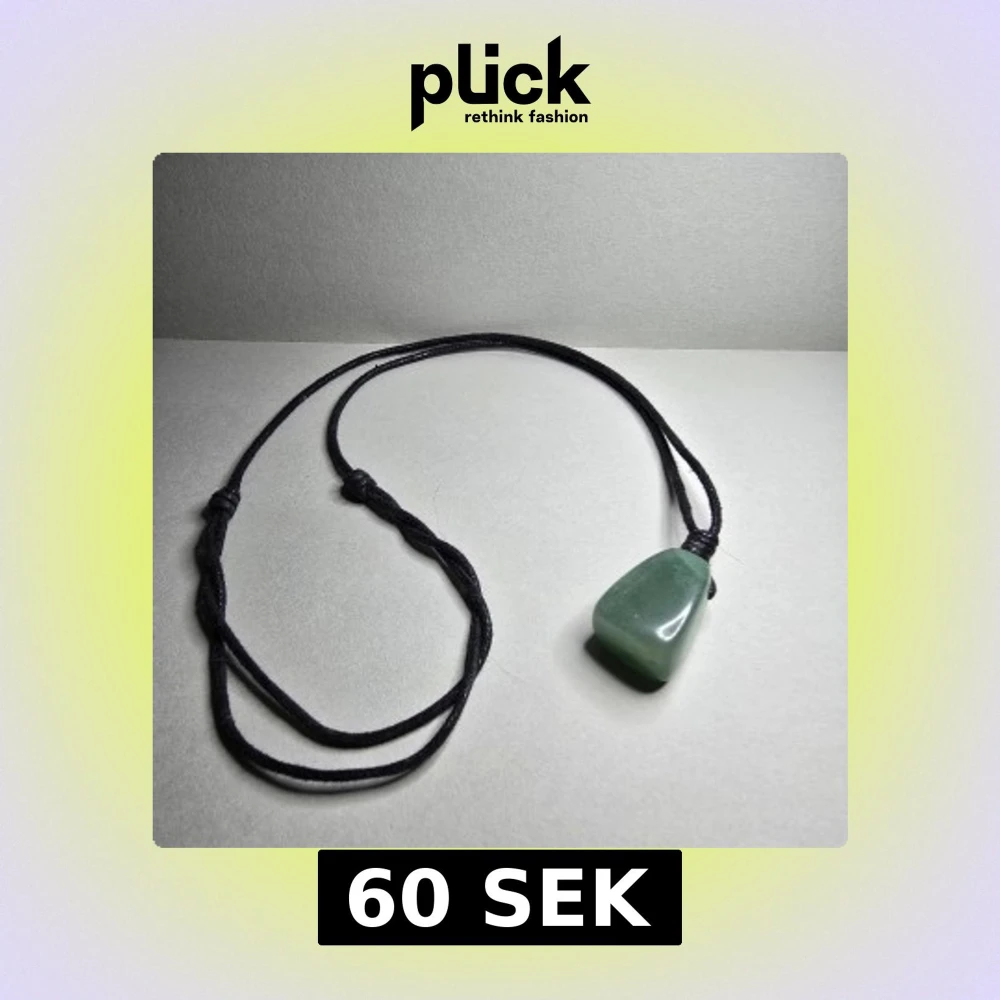 Unikt halsband med en polerad grön sten som hänge, uppträdd på ett svart justerbart snöre. Stenen har en mjukt triangulär form och ger en naturlig, stilren vibe. Perfekt för dig som gillar enkel men cool accessoar.
