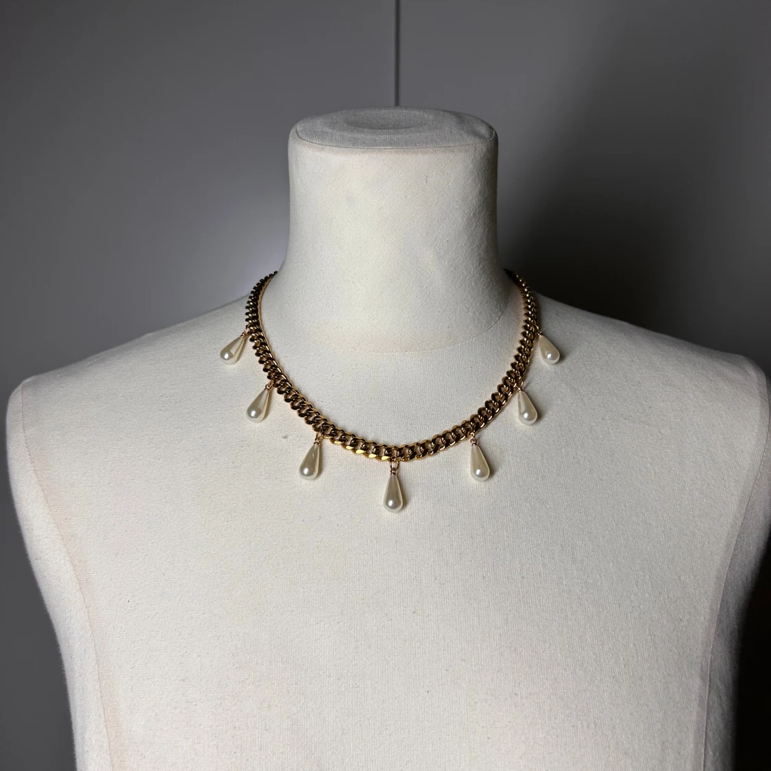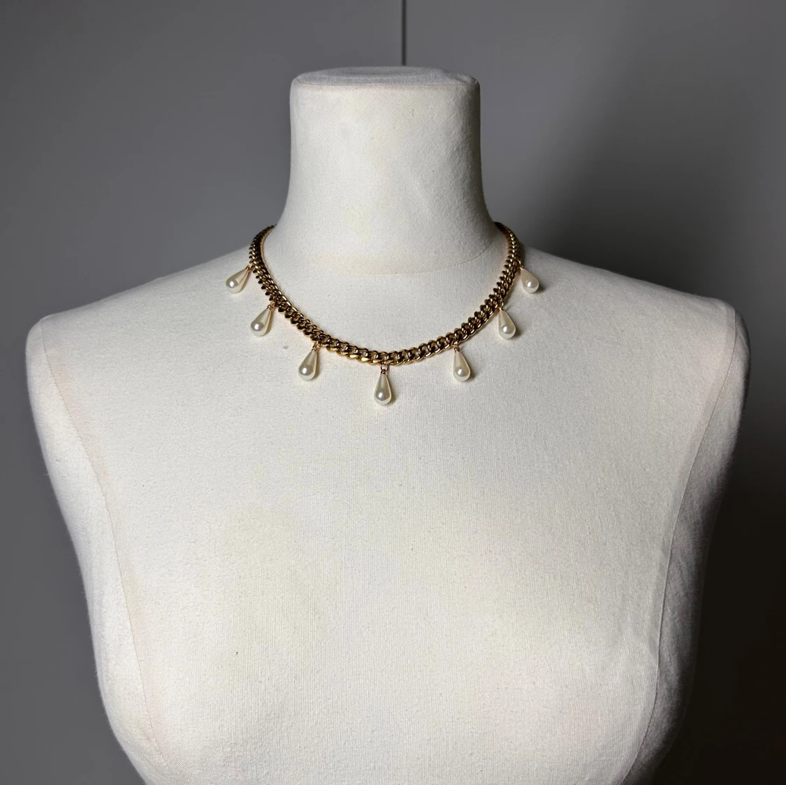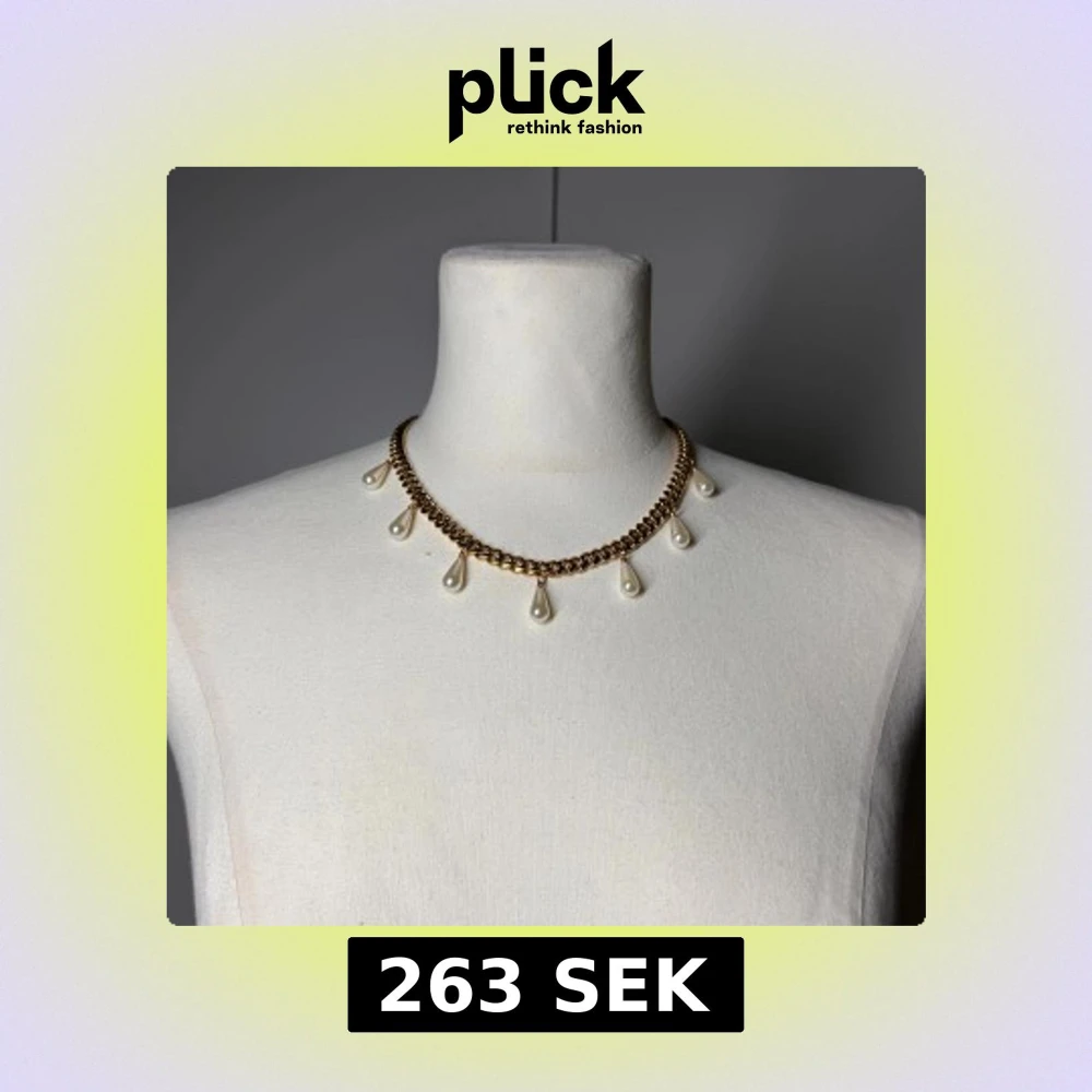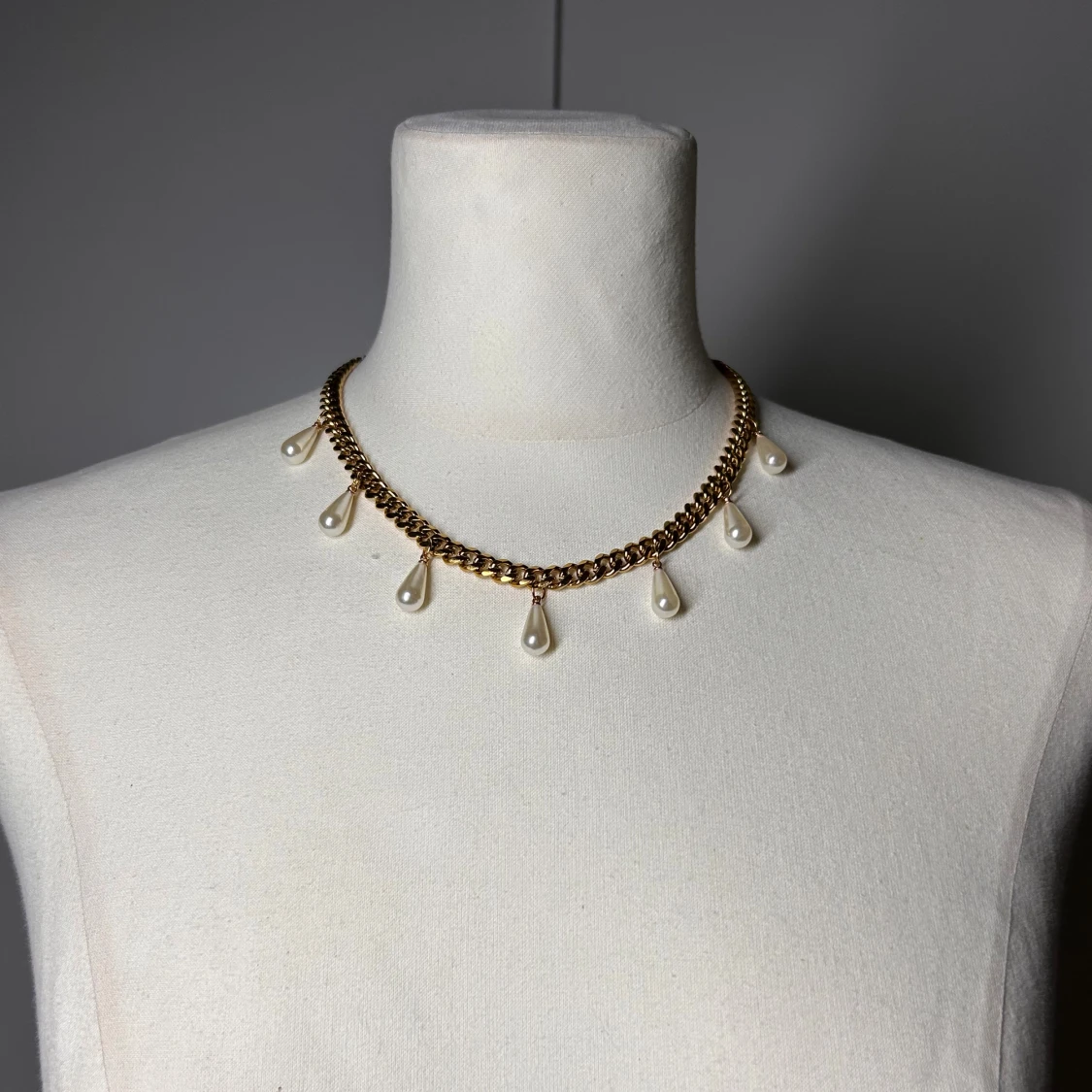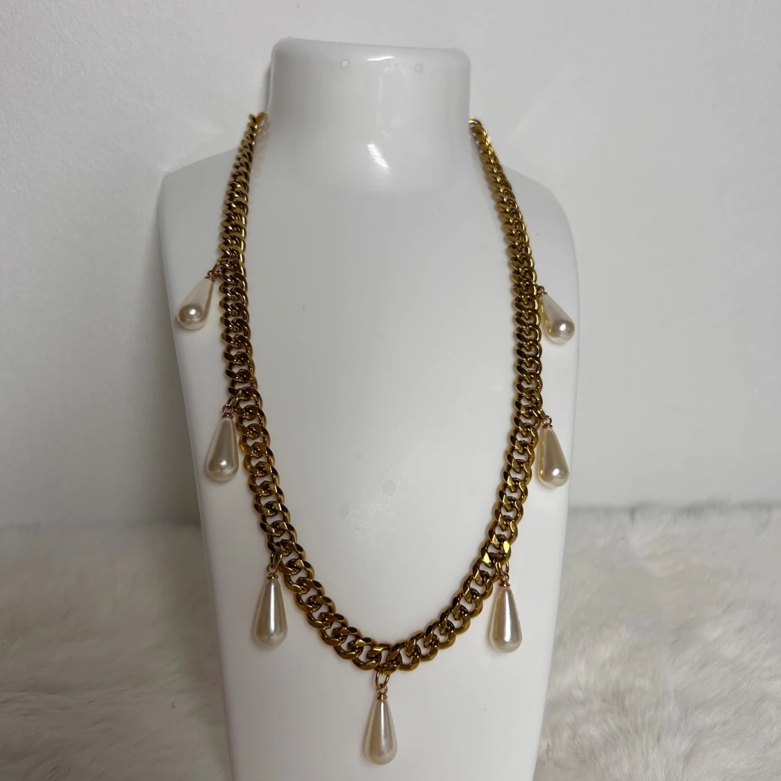 Handgjort kedjehalsband med pärlor. Kedjan är 7mm bred och 45cm lång. Allt i rostfritt stål förutom pärlorna. Fast pris satt efter materialkostnader och tillverkning. Köp gärna via köp nu, snabb leverans.