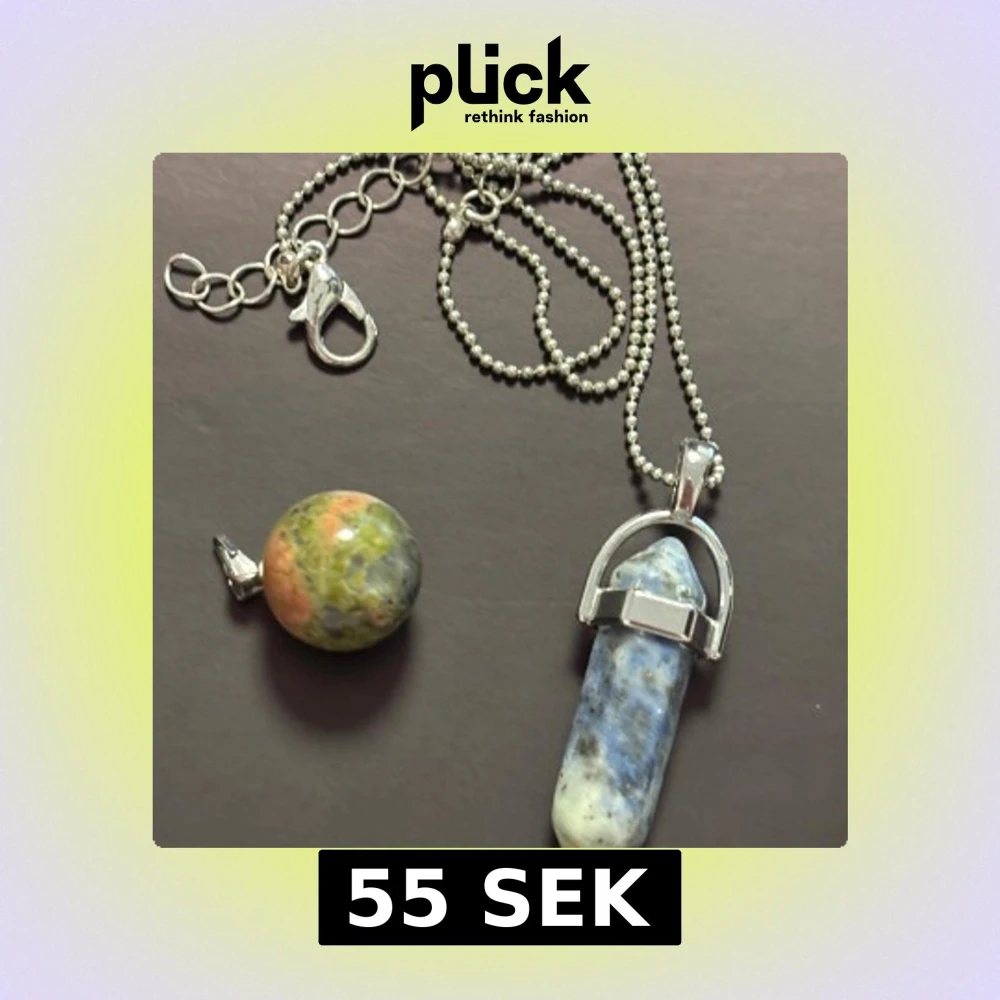Unikt halsband med två olika stenhängen – ett runt i grönt, orange och grått samt ett avlångt blåvitt kristallhänge med silverfäste. Kedjan är i silverfärgad metall med kulkedja och karbinlås. Perfekt för dig som gillar naturstenar och coola detaljer.
